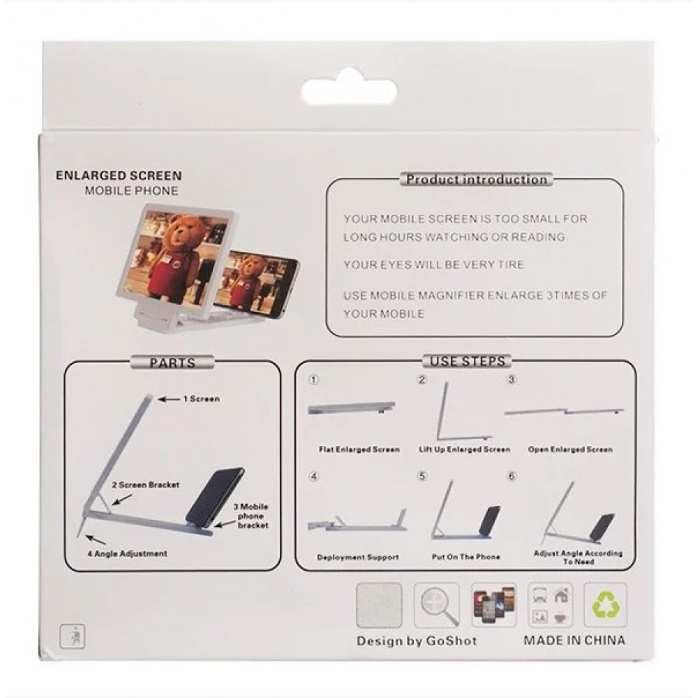 3D увеличитель экрана телефона. Любите смотреть видео на телефоне, общаться в соц сетях и сидеть в интернете, но у Вас устают глаза от маленького экрана? С помощью увеличителя экрана для мобильного телефона Вы сможете решите эти проблемы. Ваш маленький экран превратиться в 7" дисплей, как у нормального планшета. Экран способен увеличивать картинку на экране Вашего телефона в 3 раза, что позволяет с максимальным комфортом просматривать фильмы, читать электронные книги и искать интересующую информацию в интернете. Экран с 3-х кратным увеличением заменит Вам дорогостоящие планшеты. Просто поместите в устройство свой смартфон. 3D-экран компактен и его можно брать с собой в поездку, в путешествие, на дачу или в поход и наслаждаться просмотром любимого фильма или передачи вместе с близкими и друзьями. Она компактна, не требует источников питания сделана из качественного пластика и подойдет для любого мобильного устройства. Преимущества: Отличное пропускание света за счет использования акрилового материала высокого качества; Стекло имеет специальное покрытие, которое уменьшает вред для зрения от экрана телефона; Использование оптических технологий HD-усиления предотвращает возникновение усталости глаз; Удобное и безопасное для зрения увеличение; Легкий, простой, элегантный дизайн. Характеристики: Материал: Силикон, Акрил, ABS Увеличение 3x-5x, это позволит рассматривать изображения на мобильном телефоне на таком же большом экране, как у Ipad. Снижает утомляемость глаз Прочная фиксация мобильного телефона предотвращает скольжение и падение. Складной дизайн, малый объем, удобный для переноски и в деловых поездках. Цвет: черный Размер: 18,0 х 14,2 х 1,5 см