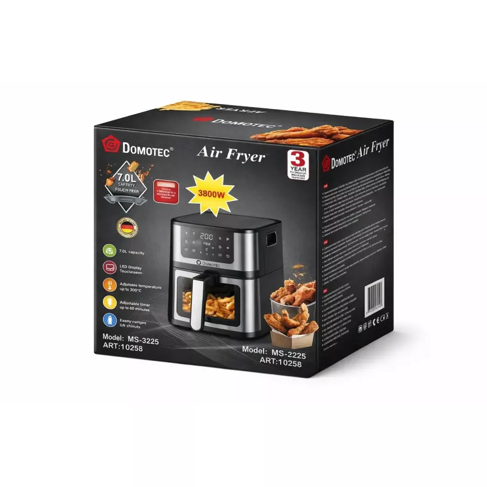 Аэрофритюрница Domotec MS-3225 с объемом 7 л и мощностью 3500 Вт позволяет готовить блюда без добавления масла, сохраняя их вкус и полезные свойства. Благодаря двум тенам и большой чаше она идеально подходит для приготовления пищи для большой семьи или компании друзей.