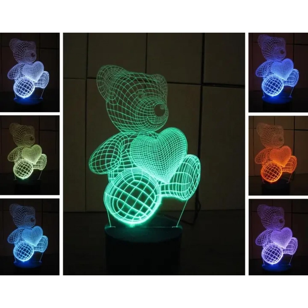 Акриловый 3D ночник-светильник Мишка Описание 3d-светильник Мишка с сердцем, 3д-ночник, несколько подсветок (на пульте), романтический подарок 3D-светильник – оптическая иллюзия, когда свет заставляет плоскую пластину с нанесенным рисунком, казаться объемной. Свет, создающий настроение! Причины для покупки 3D-светильника 3Д-ночник создаст идеальное мягкое освещение в комнате, гостиной или спальне. 3D-светильник позволит существенно сэкономить электроэнергию, когда смотришь телевизор или отдыхаешь. Ночник 3d создаст романтическую атмосферу в спальне или гостиной, заменив опасные свечи. Ночник 3д позволит ребенку, который боится темноты, спокойно оставаться самому в комнате и засыпать. Любимый герой станет настоящим другом ребенка, добавив детской комнате уюта и теплоты. 3d-светильник станет отличным декором для любого «детского» или «взрослого» интерьера. Возможность выбора любимого цвета делает ночник максимально функциональным. Приятный на ощупь пластик корпуса (базы) усилит тактильные ощущения. Поверхность легко моется и не затирается. 3д-ночник станет отличным подарком ребенку или взрослому, стильным и полезным одновременно. Светильник 3д не займет много места на столе или полке, учитывая его плоскую конструкцию. 3D Светильник имеет 16 цветов подсветки. Управление осуществляется с помощью пульта управления, или сенсорной кнопкой, расположенной на основании прибора. Регулировка яркости позволяет использовать 3D Светильник так же как и ночник. 3D Светильник работает от розетки, батареек, устройств с usb выходом. Размеры: 18 х 13,5 х 9,5 см