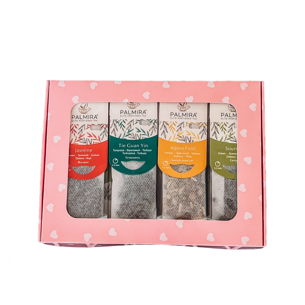 Состав: Англійський сніданок, Медовий манго, Сірий Граф, Червоний дракон, Ассам, Бризки шампанського, Ганпаудер, Жасмин, Зелений імбир, Молочний оолонг, М'ятна фантазія, Саусеп, Тегуаньинь, Сенча, Ройбуш суничний, Альпійський луг, Детокс, Королівський десерт, Гречаний , Женьшеневий улун, Карпатський Іван-чай, Малиновая мечта, Марокканский цитрус, Ройбуш классический.