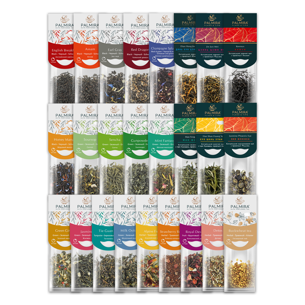 ЧОРНИЙ: Англійський сніданок, Ассам, Масала, Шу пуер з лимоном, Червоний дракон, Кимун, Дян Хун Цзинь Хао, Цзинь Цзюн Мей, Менхай Лао Шу Пуер, Карпатський Іван-чай, Сірий Граф, Медовий манго, Бризки шампанскього ЗЕЛЕНИЙ: Ганпаудер, Сенча, Марокканський цитрус, Зелений з чебрецем, Мао Фен, Око Фенікса, Жасмин, Зелений Імбир, Молочний улун, Женьшеневий улун, М’ятна Фантазія, Саусеп, Тегуаньінь ТРАВ’ЯНИЙ ТА ФРУКТОВИЙ: Альпійський луг, Ройбуш полуничний, Ройбуш класичний, Детокс, Гречаний, Королівський десерт, Малинова мрія ЖОВТИЙ: Хуо Шань Хуан Я