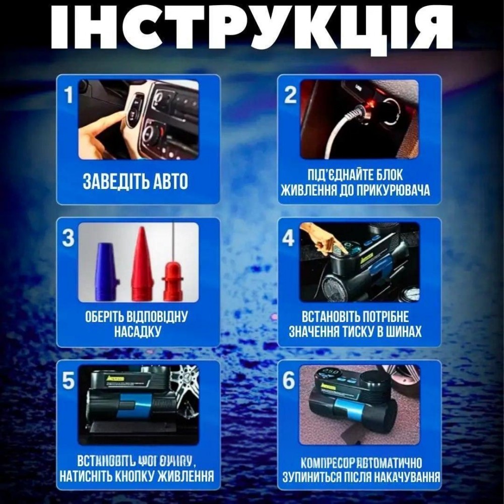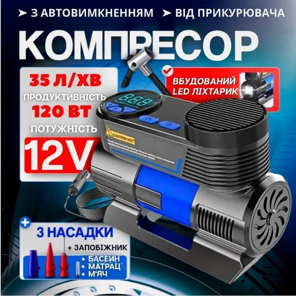 Автомобильный компрессор, электрический насос от прикуривателя 12V, с LED-фонарём Мощное устройство для накачивания шин, спортивного инвентаря, надувных изделий и другого оборудования. Благодаря высокой производительности более 70 литров в минуту компрессор позволяет быстро накачать 4 шины менее чем за 90 секунд. Преимущества ● Точное цифровое измерение давления с 4 единицами измерения (PSI, BAR, KPA, KG/CM²) ● Высокая производительность — более 70 литров в минуту ● Полная накачка 4 шин за менее чем 90 секунд ● Автоматическое отключение при достижении заданного давления ● Длинный кабель питания 2,5 м для удобного доступа ко всем колёсам ● Встроенный LED-фонарь для работы ночью ● Универсальная совместимость с 12V системами автомобилей и внедорожников ● Компактные размеры и удобная сумка для хранения Характеристики ● Тип двигателя: одноцилиндровый ● Питание: 12V ● Максимальное давление: 150 PSI ● Производительность: 70 л/мин ● Время накачки шин: около 90 секунд ● Длина кабеля питания: 2,5 м ● Материал корпуса: высококачественный пластик ● Размеры: 178 × 138 × 67 мм ● Цвет: чёрный ● Дополнительные функции: LED-фонарь, автоматическое отключение Комплектация ● Автомобильный компрессор ● 3 дополнительных насадки ● Запасной предохранитель