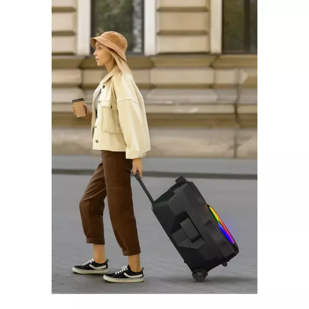 Это мощная мобильная колонка, предназначенная для использования на улице, для вечеринок, мероприятий, а также любительского караоке благодаря наличию микрофона и его поддержки. Большой размер динамика обеспечивает громкий и качественный звук, а яркие LED эффекты придают зрелищности. Удобная тележка-конструкция позволяет легко перемещать столбик, а широкий набор интерфейсов делает его универсальным для воспроизведения музыки из разных источников.