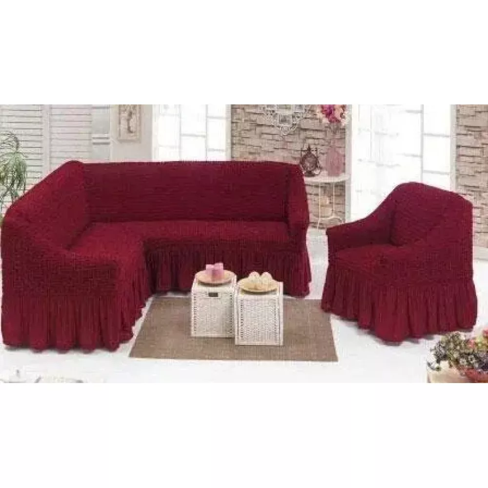 Бордовый Чехол накидка на угловой диван с креслом, комплект чехлов на угловой диван и кресло с оборкой Турция