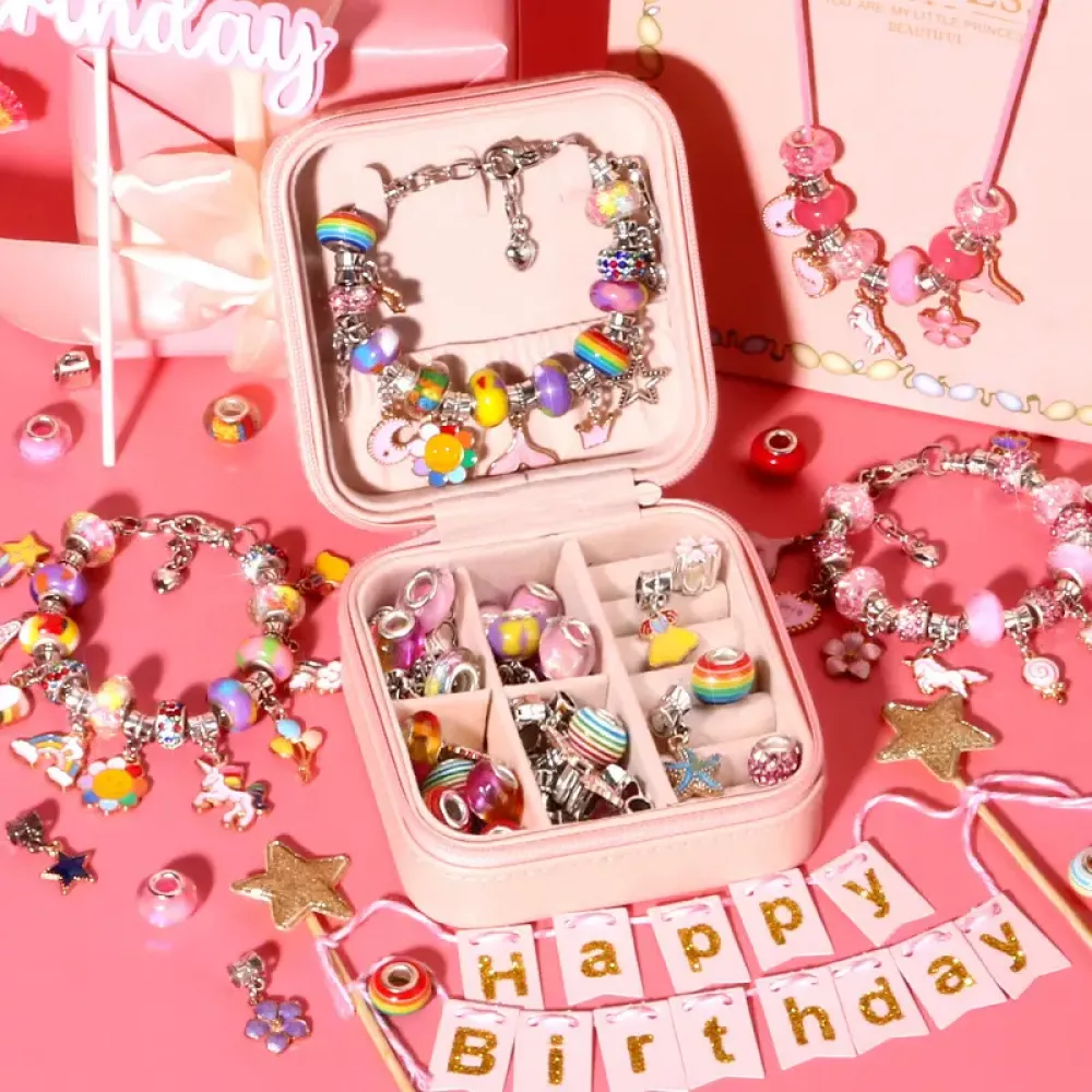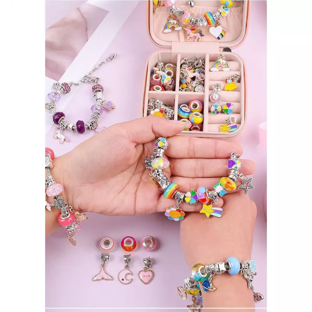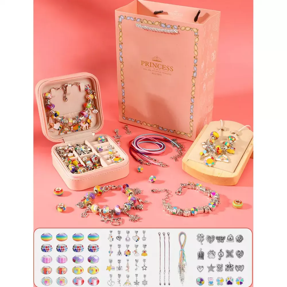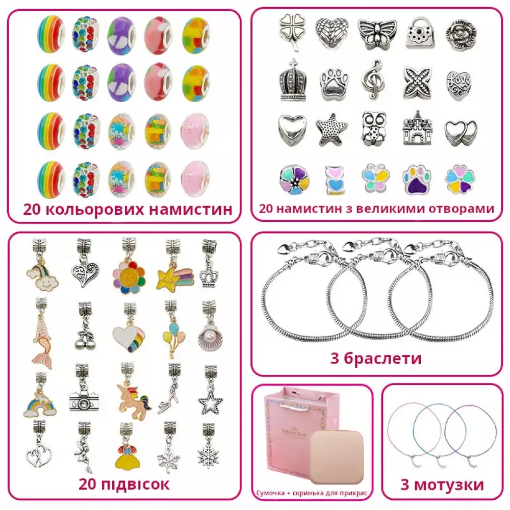 Цей стильний подарунковий набір для створення браслетів із намистин – чудовий подарунок для маленької модниці. Він включає 60 шармів, 3 браслети і 3 підвіси - цих компонентів цілком достатньо, щоб ваша дочка змогла створити прикраси у власному стилі.