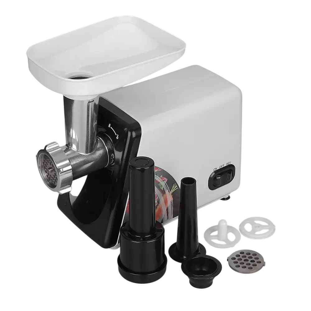 В комплект входят 2 решётки с разным диаметром отверстий, что даёт возможность регулировать степень измельчения фарша для различных рецептов. Также предусмотрена специальная насадка для приготовления домашних колбас. Устройство оснащено функцией защиты двигателя от перегрева и перегрузки, что гарантирует безопасность использования и увеличивает срок службы прибора.