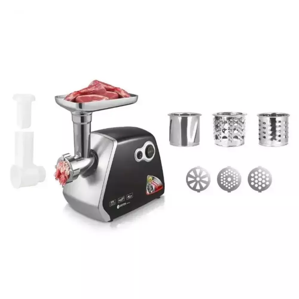 BITEK BT-3400 - Мясорубка с электрическим приводом, которая имеет функцию реверса и в комплекте с насадками для приготовления колбасы и блюда "Кеббе", имеет мощность 3500 Вт. Она легко справляется с измельчением мяса, рыбы, грибов и формированием колбасок. При этом она отличается низким уровнем шума при работе.