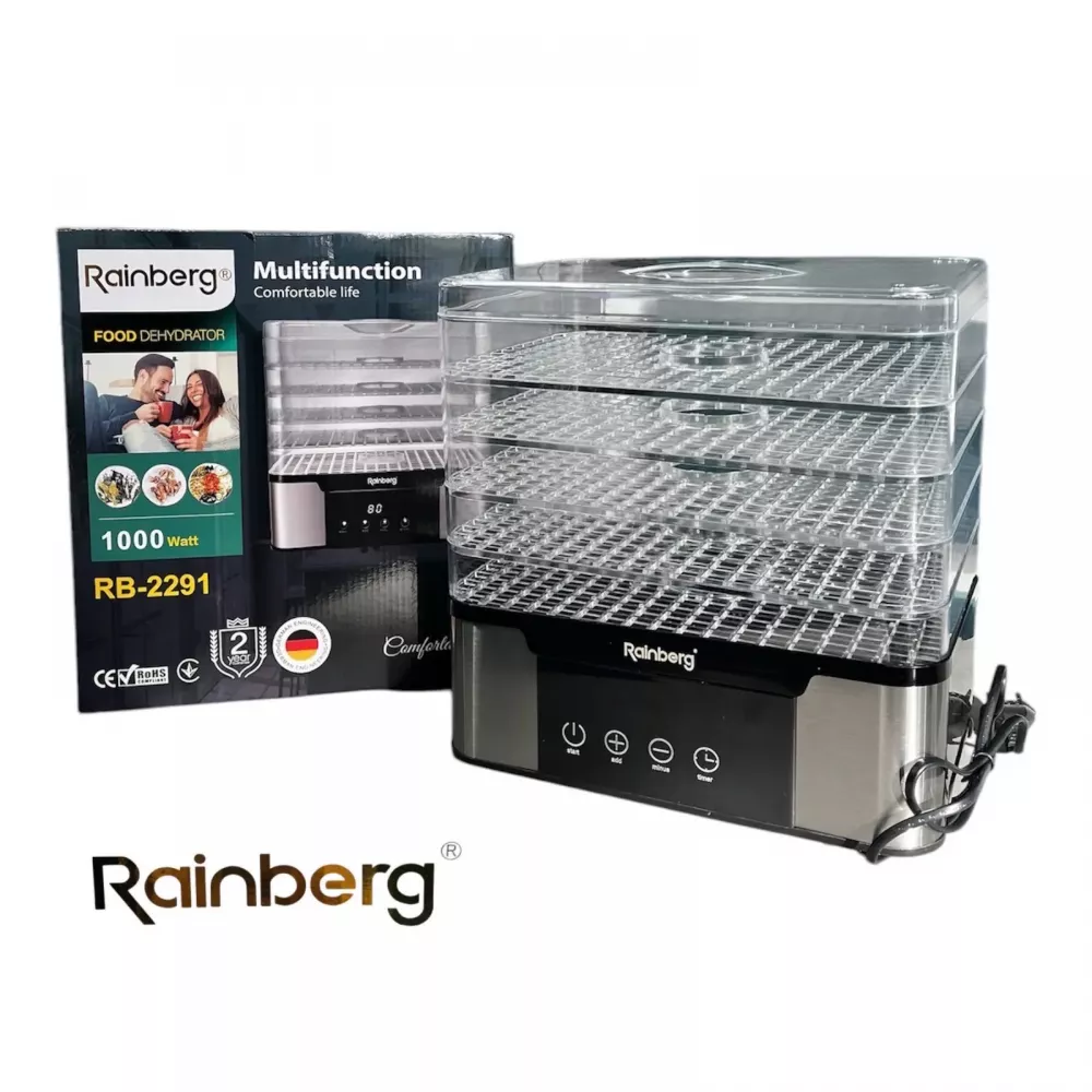 Электрическая сушилка Rainberg RB-2291 – это современное, надежное и простое в использовании устройство для бережной сушки овощей, фруктов, ягод, грибов, трав, зелени, мяса и других продуктов. Мощность 1000 Вт и система равномерной циркуляции горячего воздуха позволяют быстро обезвоживать продукты, сохраняя максимум полезных веществ, вкуса и цвета.