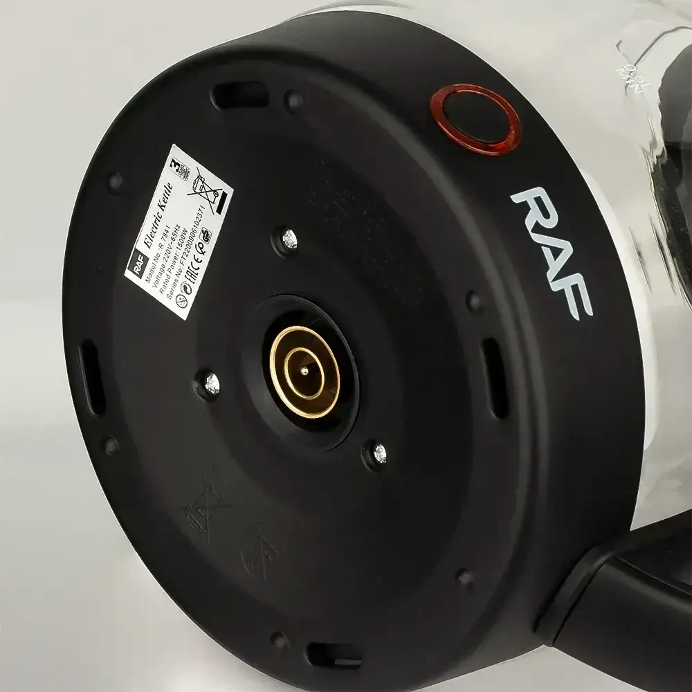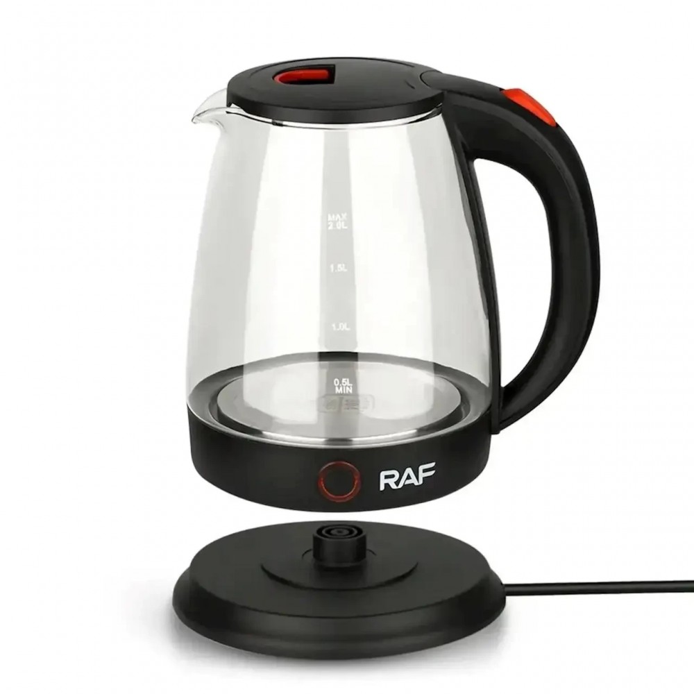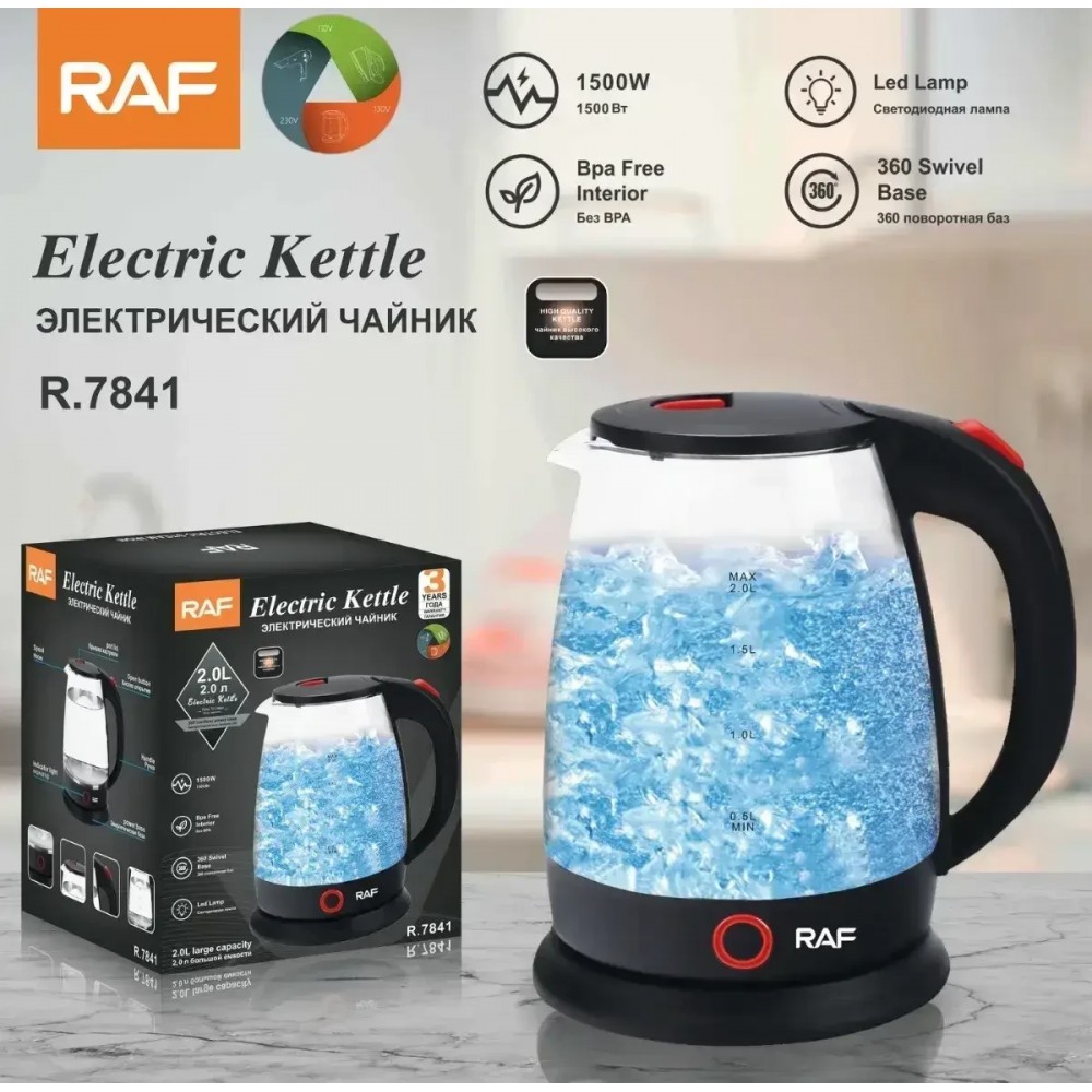 Электрический стеклянный чайник RAF-7841 - выполнен из закаленного стекла, не боящегося относительно высоких температур. Подключается к сети на 220В через круглую питающую базу и вращается на 360°.