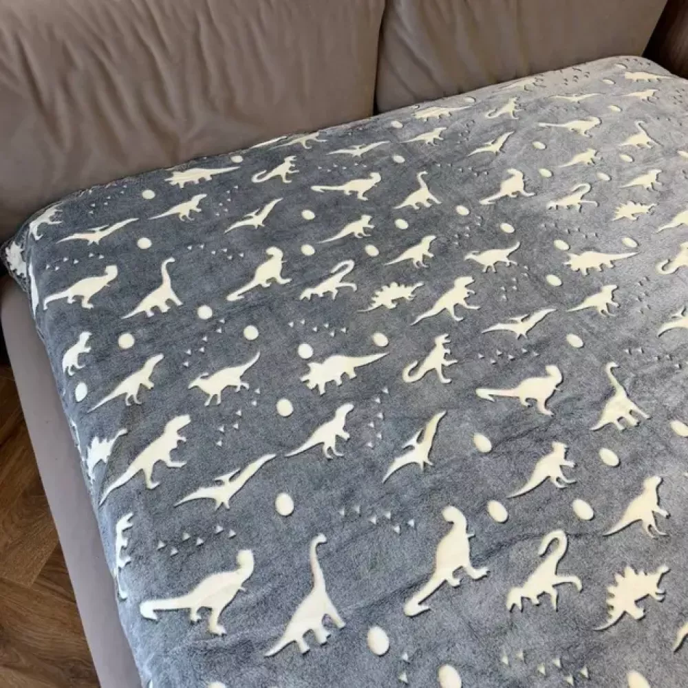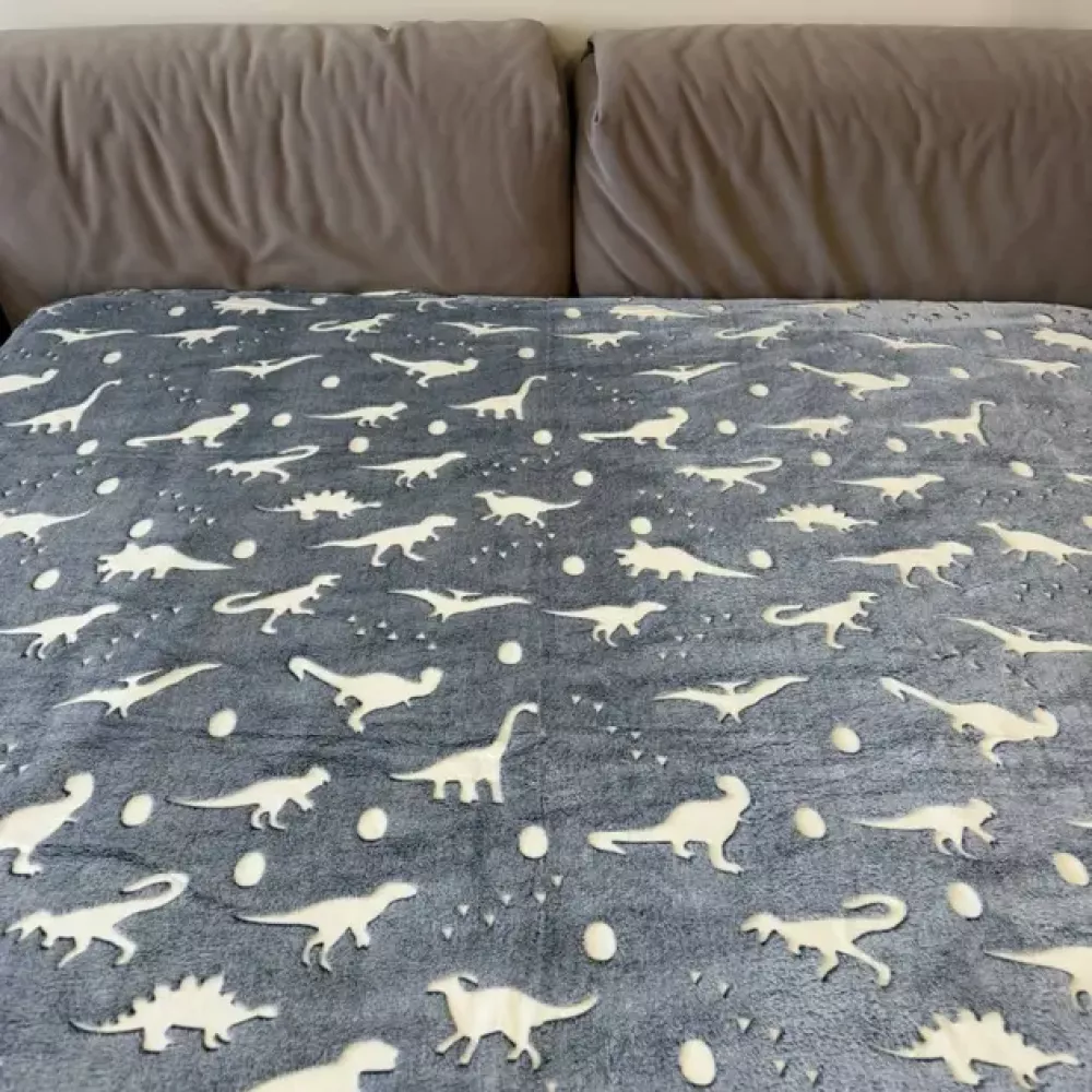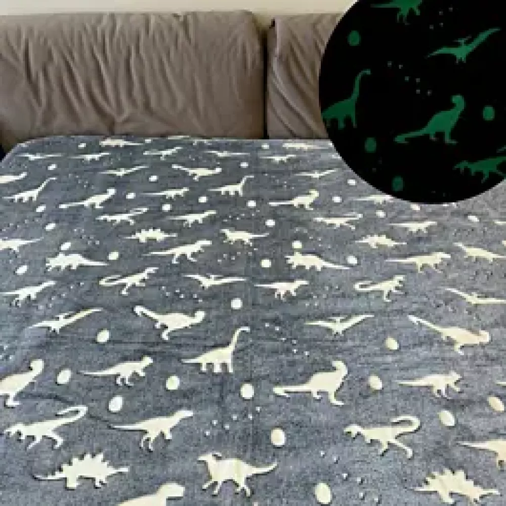 Мягкий флисовый плед серого цвета с декором с изображением светящихся динозавров в темноте.