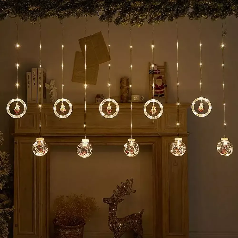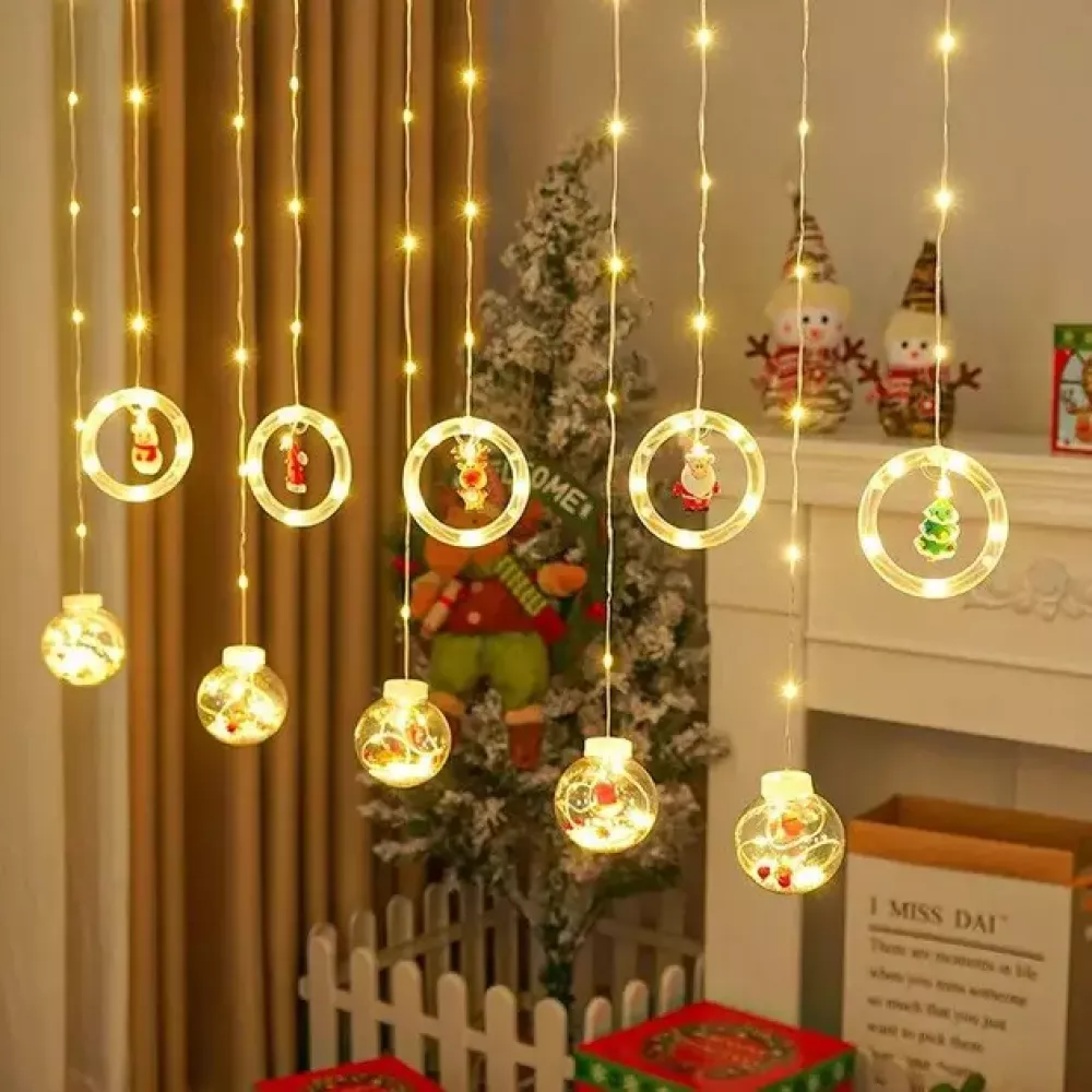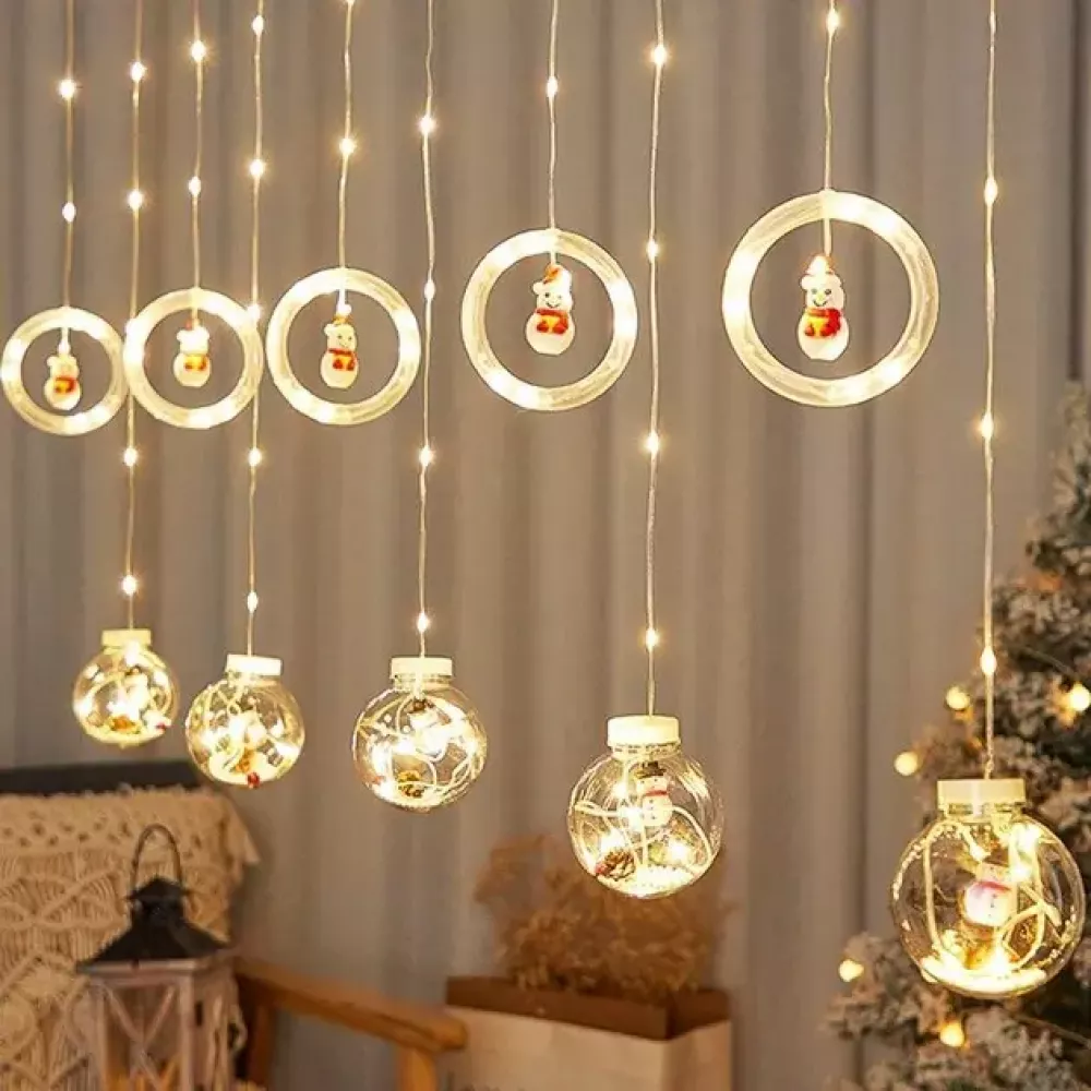 Гирлянда штора 3м с теплым желтым свечением "Круги и шары" елка, снеговик, дед мороз, олень, шапка SF-50