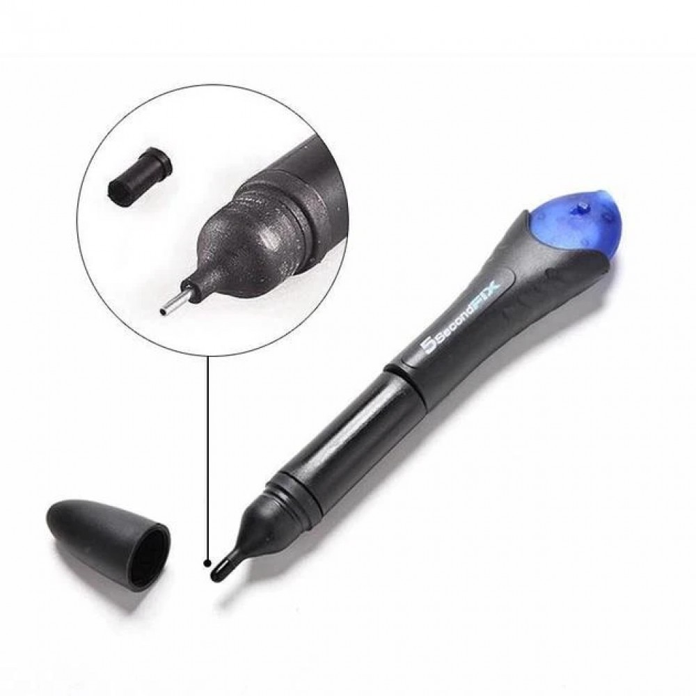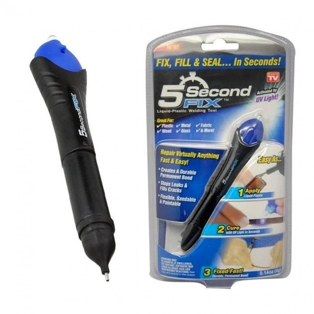 Описание Горячий ультрафиолетовый супер клей 5 Second Fix, мощное средство для ремонта В отличие от простого клея, горячий клей обеспечивает надежное соединение любых материалов. Использовать карандашный клей можно для устранения больших и маленьких поломок. Он пригодится в домашнем обиходе, для мелкого ремонта, а также будет незаменим в автосервисе, для склеивания мелких металлических предметов, пластика и ремонта электропроводки. ИСПОЛЬЗОВАНИЕ: Просто нанесите клей на подготовленную поверхность, соединяете части и сушите несколько секунд ультрафиолетовыми лучами, находящимися с противоположной стороны ручки. Отремонтированной вещью можно воспользоваться уже через 5 секунд. Эта технология используется стоматологами в зубных герметиках. Жидкий пластик 5 Second Fix не токсичен и очень прочен. Он создает соединение гораздо крепче, чем любой клей или эпоксидную смолу. Но очевидным преимуществом такого соединения является его гибкость, он прекрасно работает на изгиб. Место соединения можно шлифовать и окрашивать. ПРЕИМУЩЕСТВА: Поддается шлифовке Легко закрашивается (можно приступать к окрашиванию через несколько секунд после нанесения); Быстро высыхает (за 5 секунд) Позволяет корректировать поверхность для применения УФ-излучения. Прекрасно работает на изгиб. ФУНКЦИИ: Плотность: 1,1 г на см 3 ; Вязкость: 20 мПа. с; Объем клея: 4 гр. Питание: 2 батарейки типа CR1620 (в комплекте) Термический распад клеевого шва: 265 градусов по Цельсию; Цвет: черный. Клей фиксатор 5 Second Fix в форме фломастера – это жидкий пластик, который за 5 секунд затвердевает под действием ультрафиолетовых лучей. Горячий клей Second Fix позволяет быстро и легко отремонтировать любую вещь, с помощью технологии жидкого стекла, он скрепляет любые поверхности в течение 5 секунд!