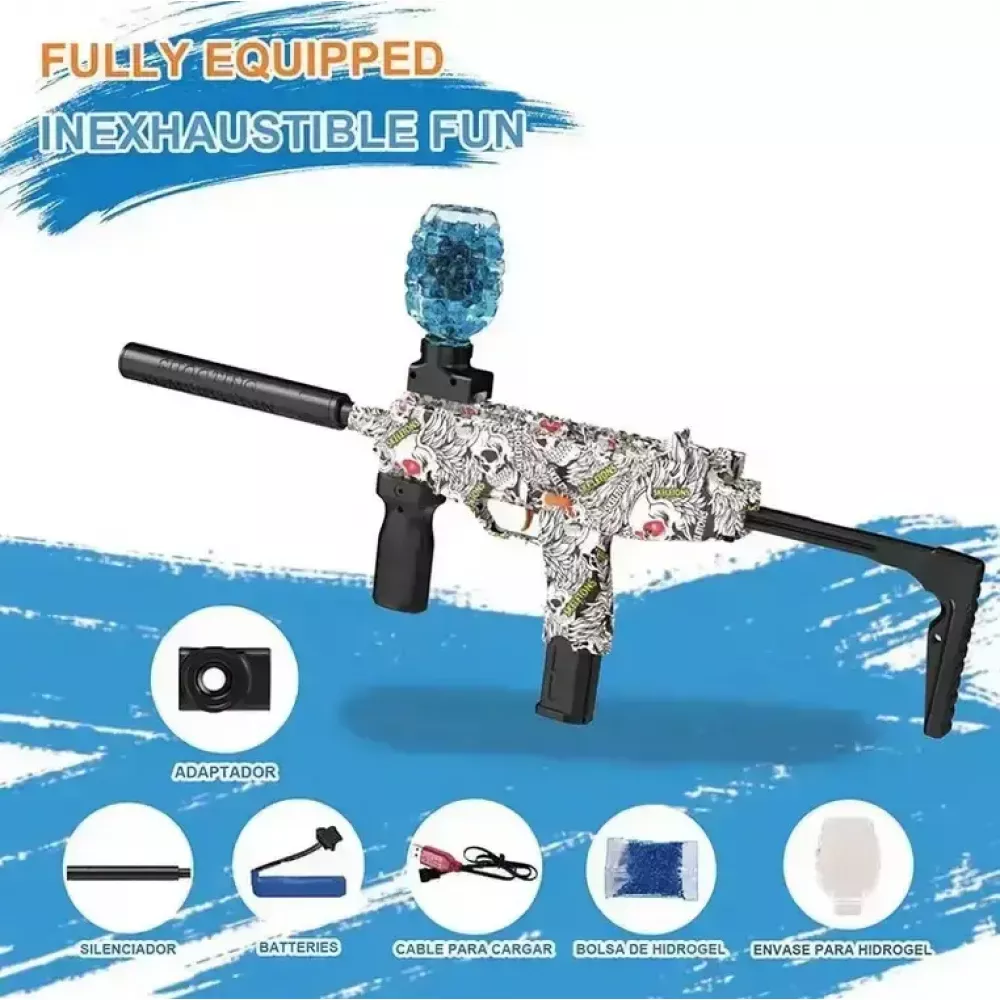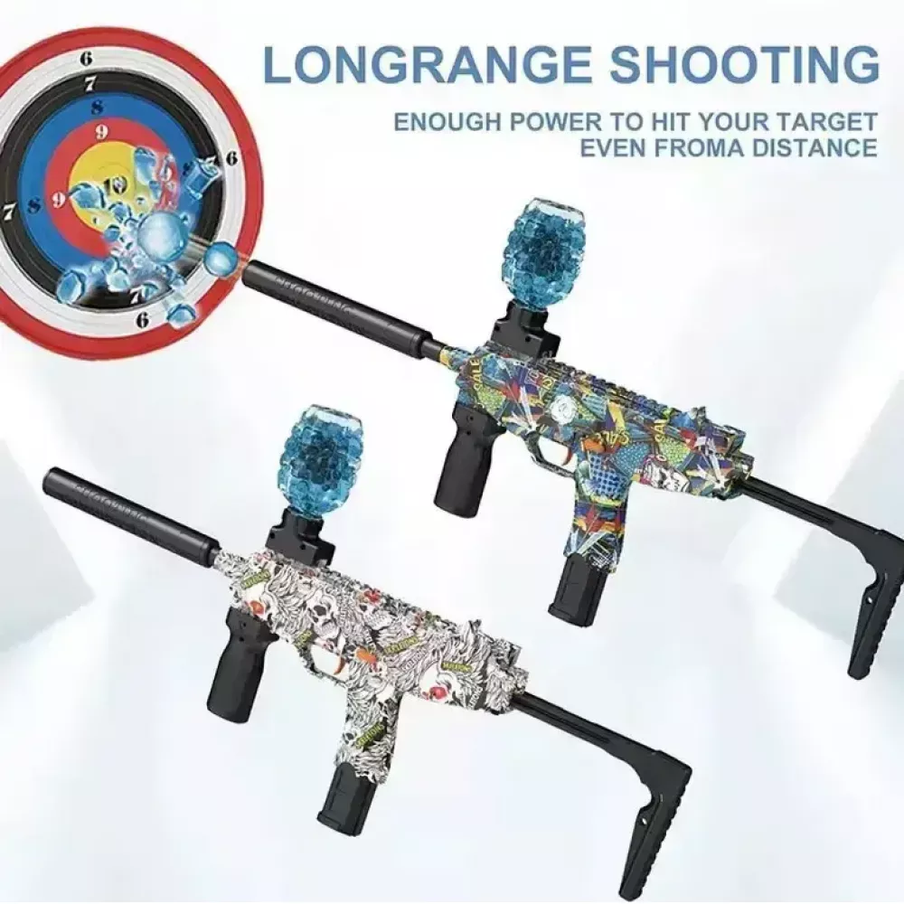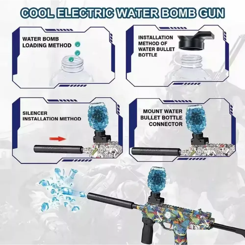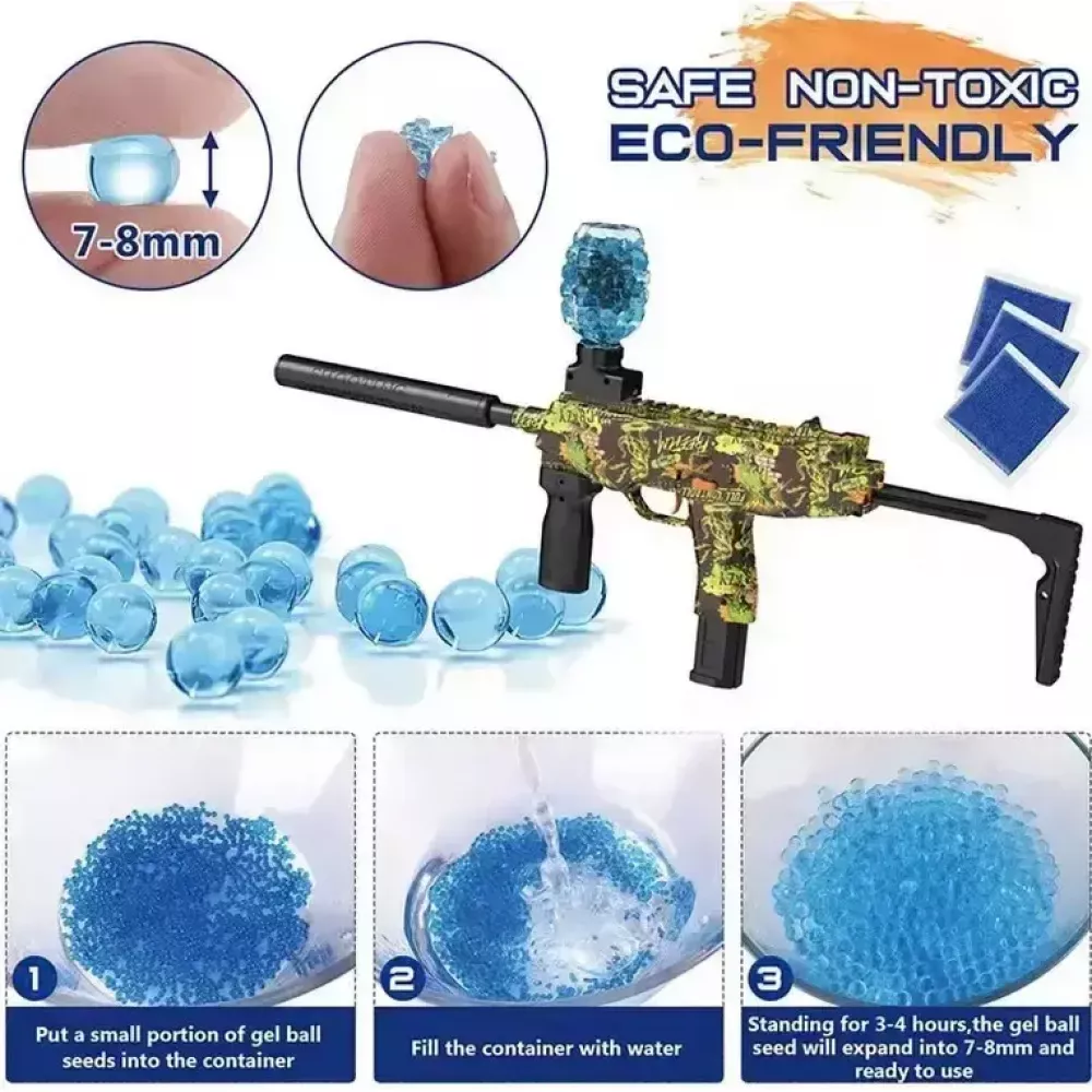 Бластер имеет простую сборку и стреляет на расстоянии до 25 метров. Пулемет с гелиевыми орбизами полностью безопасен и не травматичен при соблюдении правил сохранности. Стреляет в автоматическом режиме орбизами (диаметр которых 7-8мм) благодаря мощному аккумулятору. Это полный автоматический пистолет с глушителем и верхним магазином.