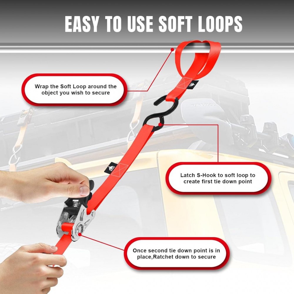Набір стяжних ременів з храповим механізмом, S-гачками та захисними петлями (Soft Loops) 4 шт., 680 кг TORIN TRZD-RL