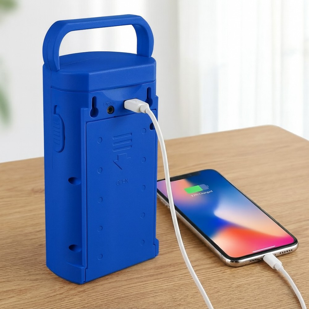 Фонарь можно использовать как настольный светильник или переносной фонарь с ручкой. Он выручит при отключении электроэнергии, на лестничной клетке, в частном доме, мастерской или на выезде. Наличие USB-выхода позволяет при необходимости подзарядить мобильный телефон или небольшой гаджет. Через разъём DC возможно подключение солнечной панели (при наличии), что удобно для автономного использования.