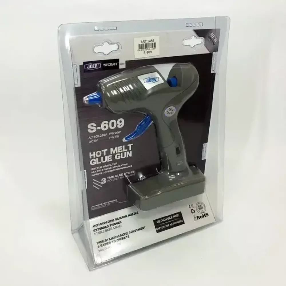 Клеевой пистолет S-609 – это универсальный инструмент для быстрой и прочной склеивания различных материалов: дерева, пластика, бумаги, стекла, керамики и декоративных элементов. Легкая и удобная конструкция позволяет использовать как для рукоделия, так и бытового ремонта. Устройство может работать как от сети 220 В, так и от батарей АА, что делает его мобильным и пригодным для использования в любых условиях.
