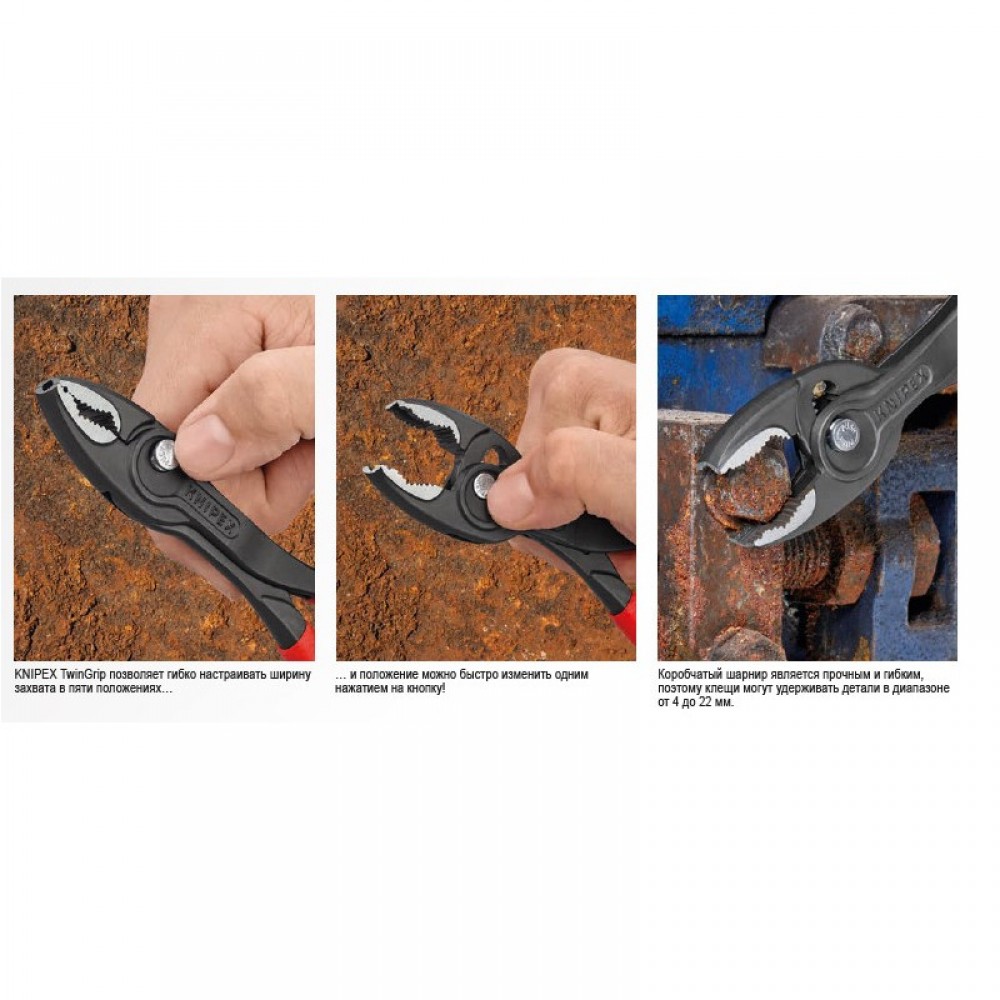 Унікальна комбінація: функція переднього і та бокового захоплення, коробчатий шарнір, Кнопкова регулювання Дуже тонкі кліщі дозволяють працювати навіть в обмеженому монтажному просторі з вузькою зоною розвороту для досягнення швидких результатів Передня сторона губок з потужним захопленням, міцними зубами і високим коефіцієнтом зчеплення на верхівці губок