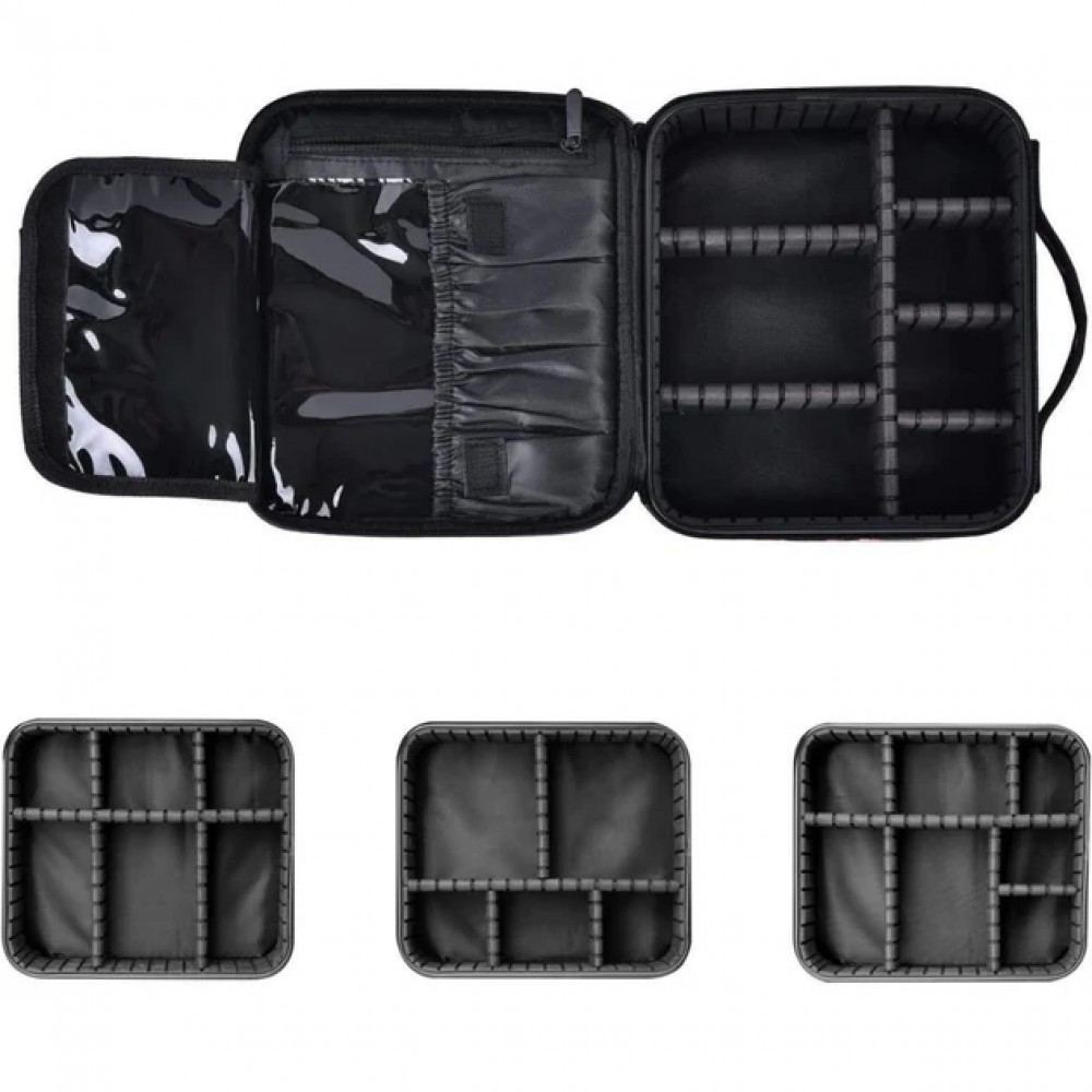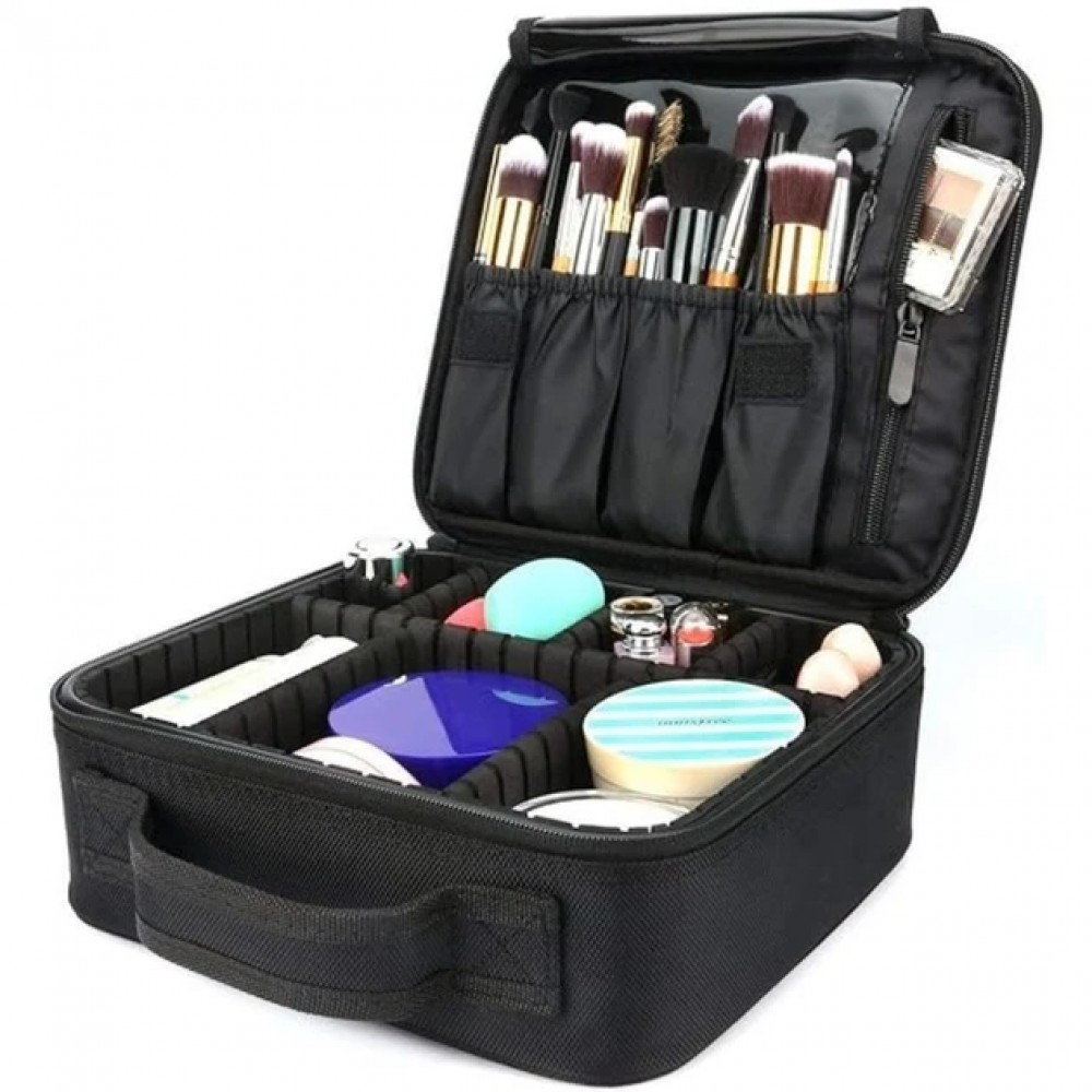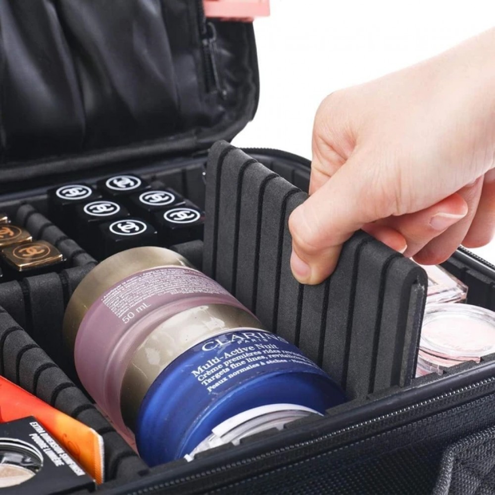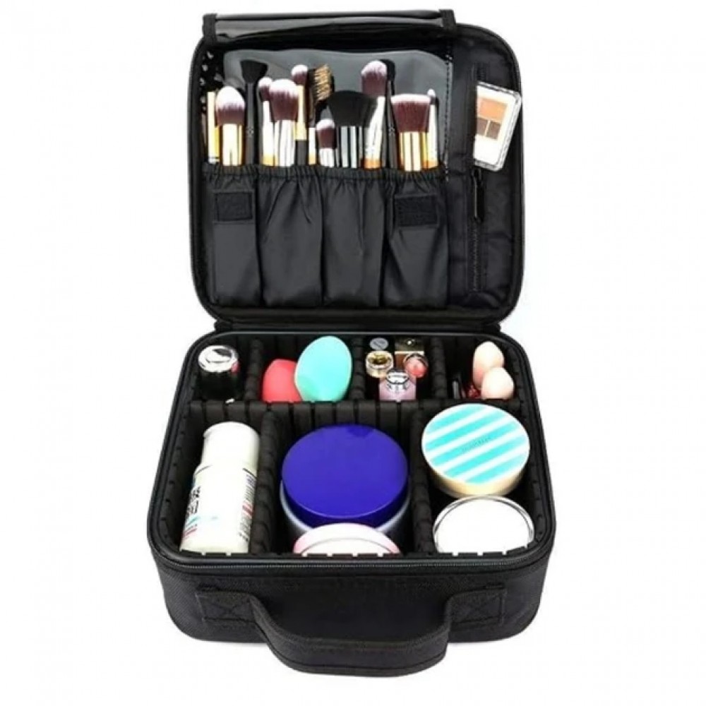 Внутренние отделения косметички можно регулировать, перемещая перегородки. Косметичка также оснащена специальными карманами для кистей и отделением на молнии, чтобы все ваши вещи были в порядке.