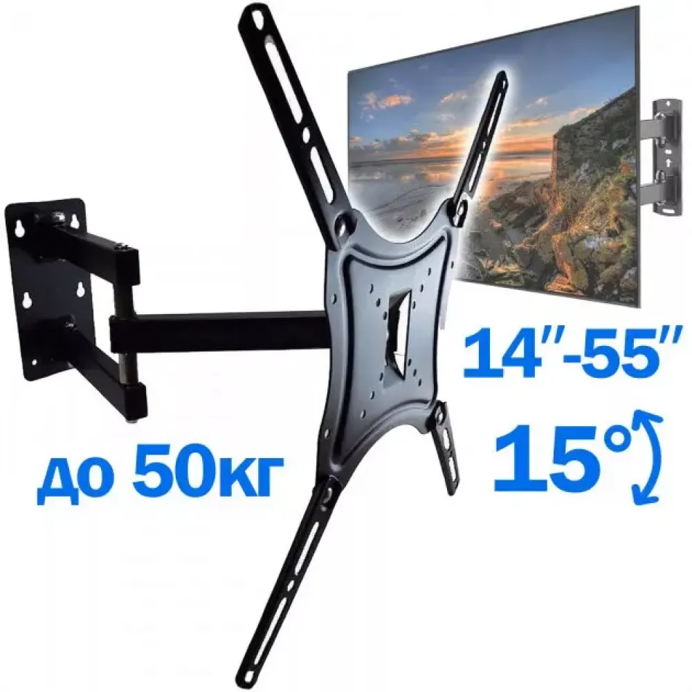 Кронштейн для крепления телевизора на стену позволяет установить телевизор или монитор с диагональю от 14" до 55" дюймов в самом удобном для вас положении. Кронштейн полностью соответствует стандарту VESA, что позволяет установить телевизор/монитор со стандартным креплением 50x50, 75x75, 100x100, 100x200 или 200x200 мм. В комплекте с кронштейном есть все необходимые инструменты для монтажа. Данный кронштейн предусматривает возможность поворота телевизора по вертикали в пределах +/-15° градусов, что невероятно удобно при использовании. Теперь просмотр станет еще удобнее.