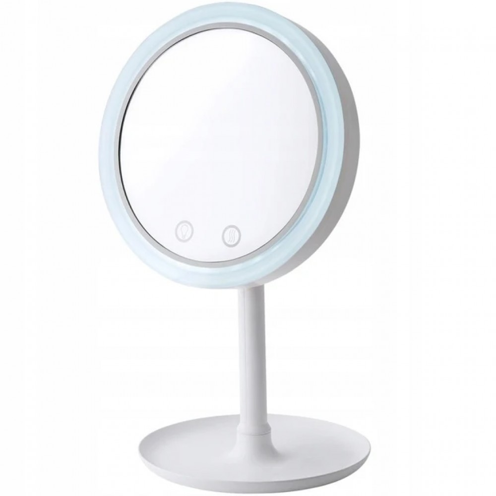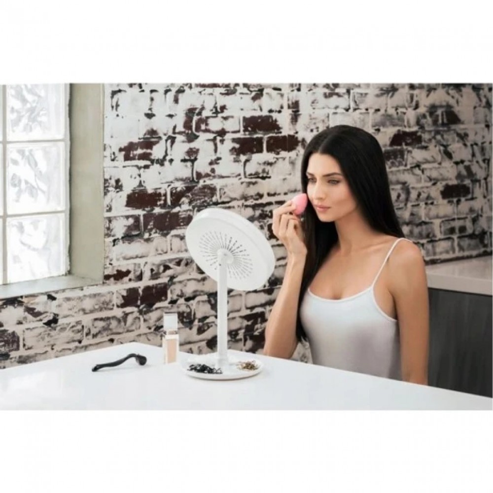 Зеркало имеет увеличивающую в 5 раз зеркальную поверхность, встроенную подсветку а так же встроенный вентилятор, который помогает обеспечить прохладу во время нанесения макияжа. Профессиональные визажисты очень хорошо знают, что во время на несения макияжа кожа должна оставаться сухой. При необходимости зеркало можно использовать как настольную лампу: управление подсветкой происходит с помощью сенсорной кнопки.