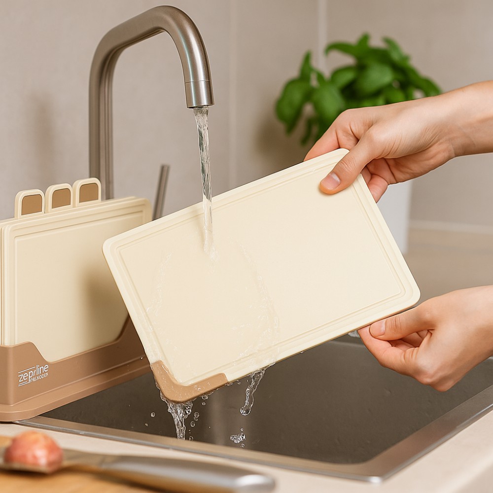 Доски изготовлены из высококачественного пищевого пластика, не впитывают запахи, устойчивы к влаге и царапинам. Каждая доска имеет двустороннюю рабочую поверхность и антискользящие элементы, что делает процесс нарезки максимально удобным и безопасным.