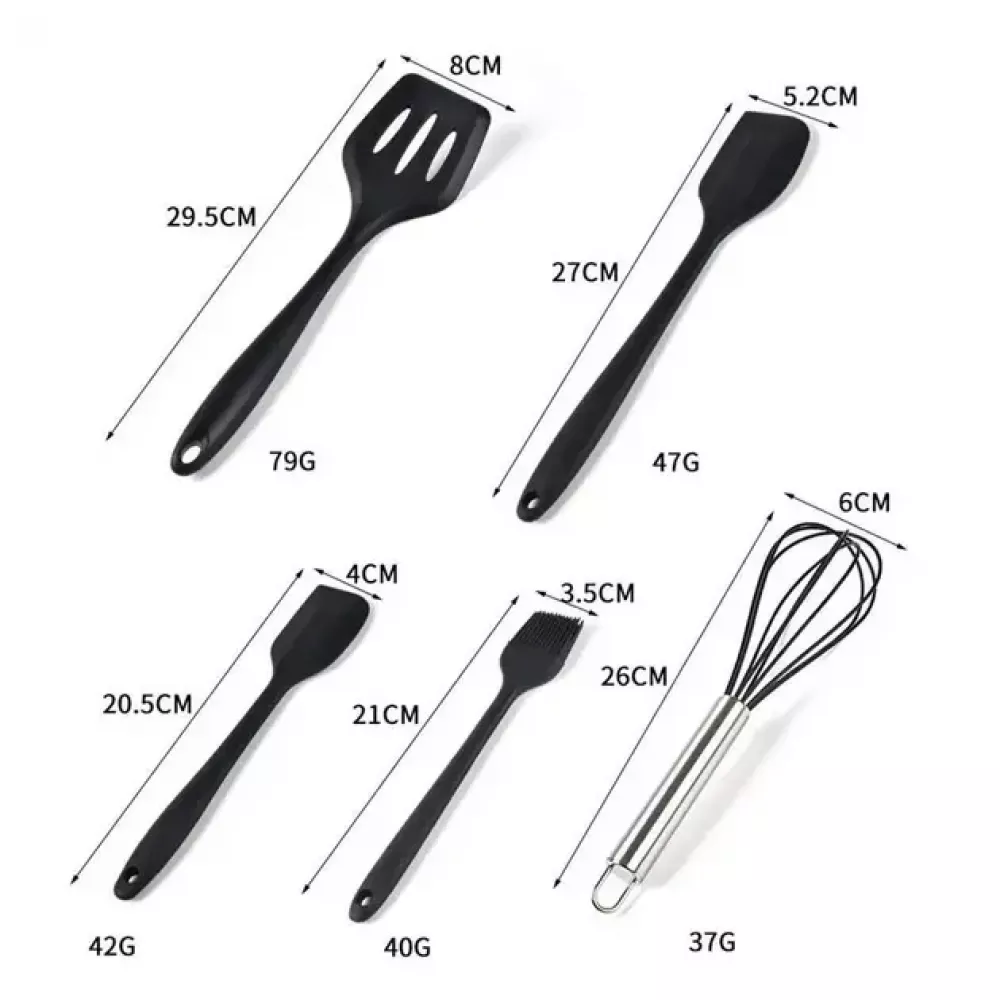 Каждый аксессуар выполнен со сверх термостойкого нетоксичного силикона премиум-класса, который защищает Вашу посуду от царапин, а также нержавеющей стали. Поместить такой комплект можно на стенке Вашей кухни с помощью крючков, он не займет много места и украсит интерьер.