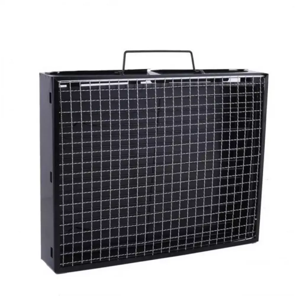 Все детали BBQ Grill Portable склепаны между собой, а сам мангал складывается в форму удобного кейса, что не позволит вам потерять важную деталь и сэкономить место. Мангал оборудован центральными ручками, которые не нагреваются. В комплекте с мангалом Вы также получите решетку-гриль, из пищевой стали. В мангале также предусмотрены проемы под решетку-гриль, которые позволяют фиксировать ее на двух уровнях, что значительно расширит ваши возможности в выборе продуктов и приготовлении блюд. Решетка-гриль складывается и легко помещается внутрь мангала.