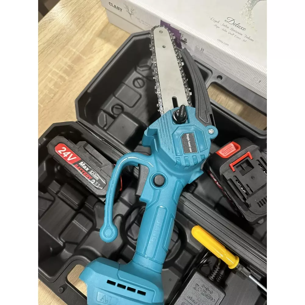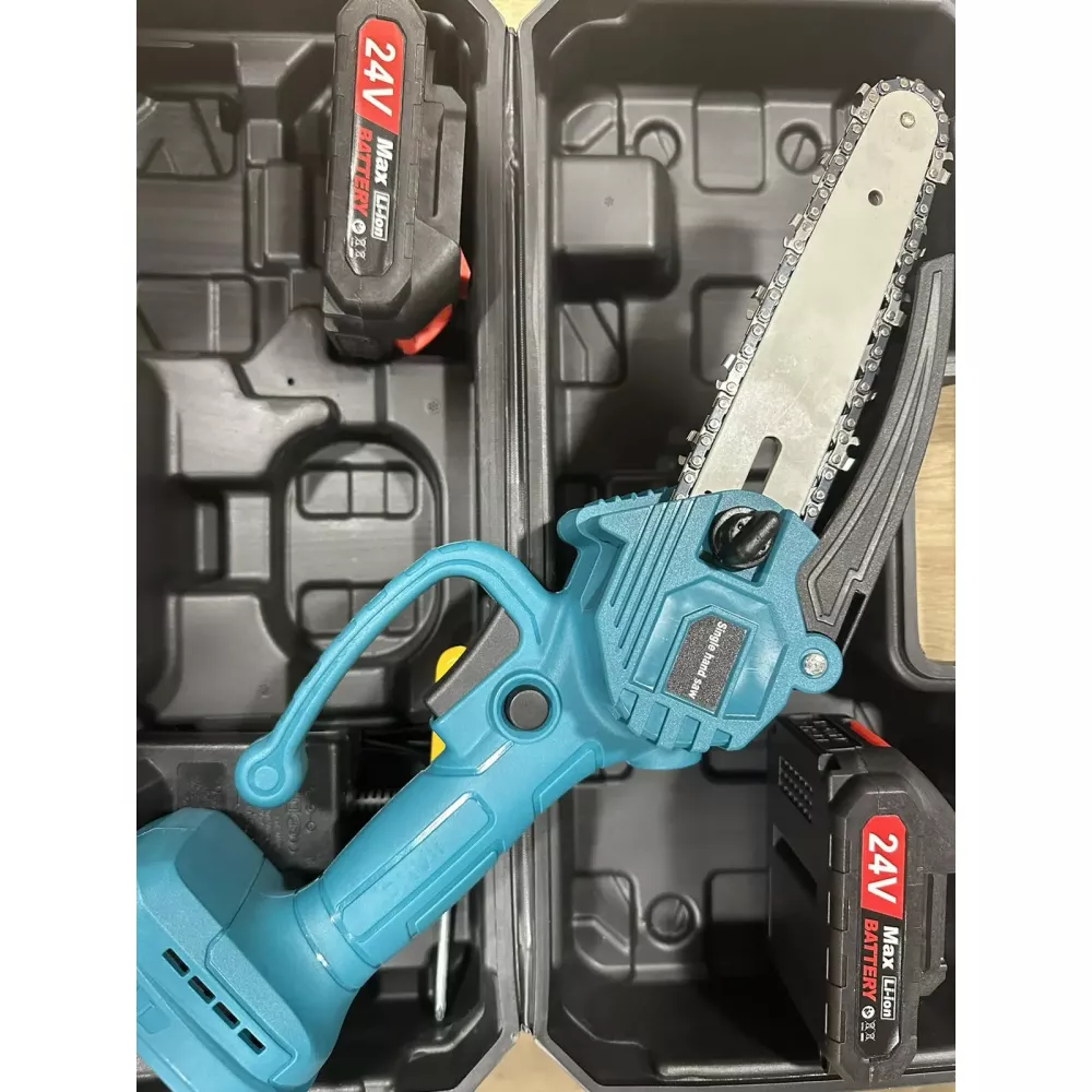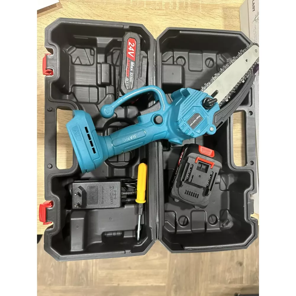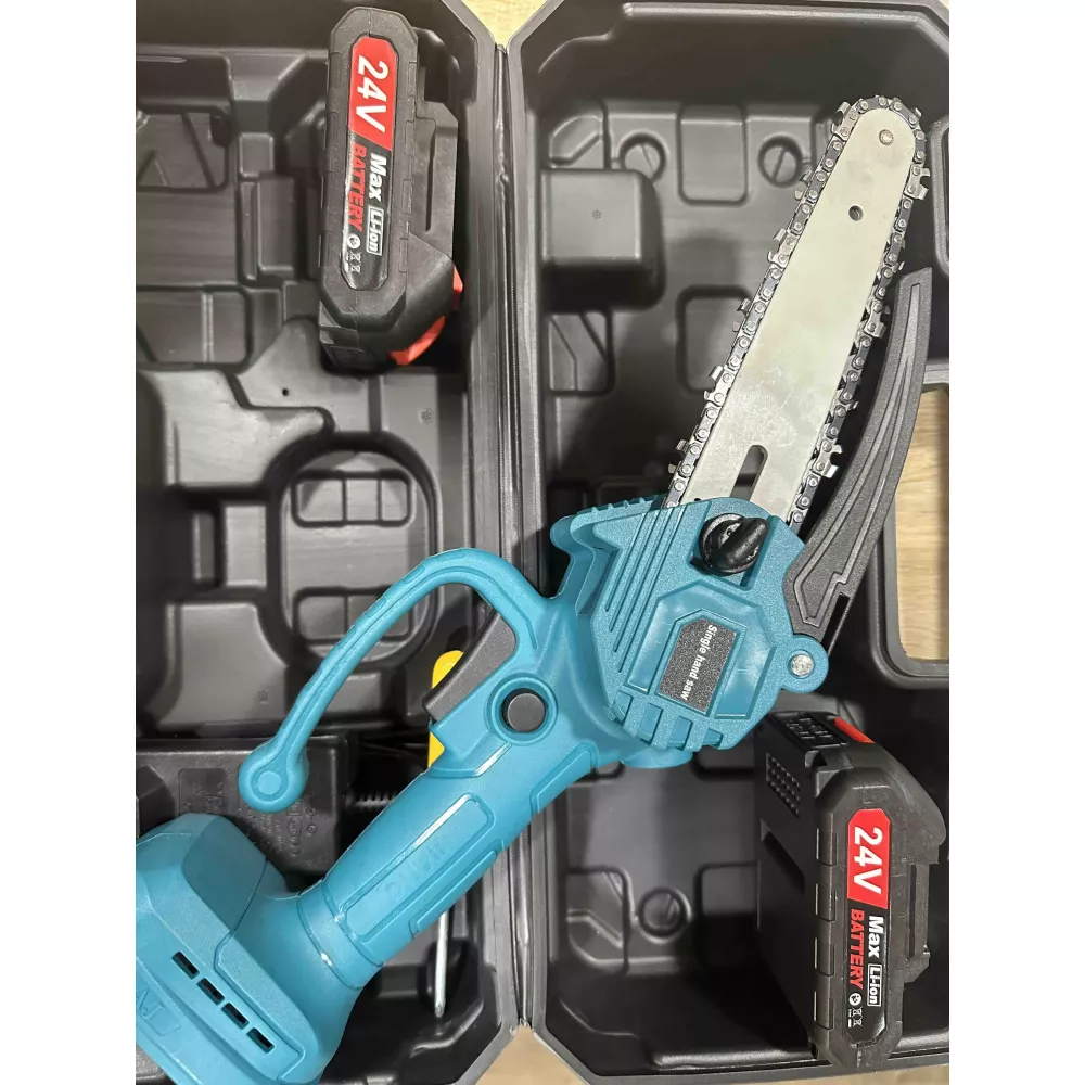 Мини пила (24В, 5,0 Ач) Веткорез - это универсальный режущий инструмент, подходящий для широкого круга задач, включая обрезку деревьев и кустарников, резку и измельчение садового мусора, а также небольшие деревянные конструкции. Она оснащена пильной цепью диаметром 1/4", которая обеспечивает исключительную производительность и мощный результат резания. Инструмент оснащен нескользящей рукояткой управления, обеспечивающей идеальную эргономику при работе. Безопасность работы обеспечивается гибким защитным кожухом цепи и индикатором уровня заряда. В комплект входят мини-пила, зарядное устройство, два аккумулятора, а также удобный кейс для хранения и транспортировки.