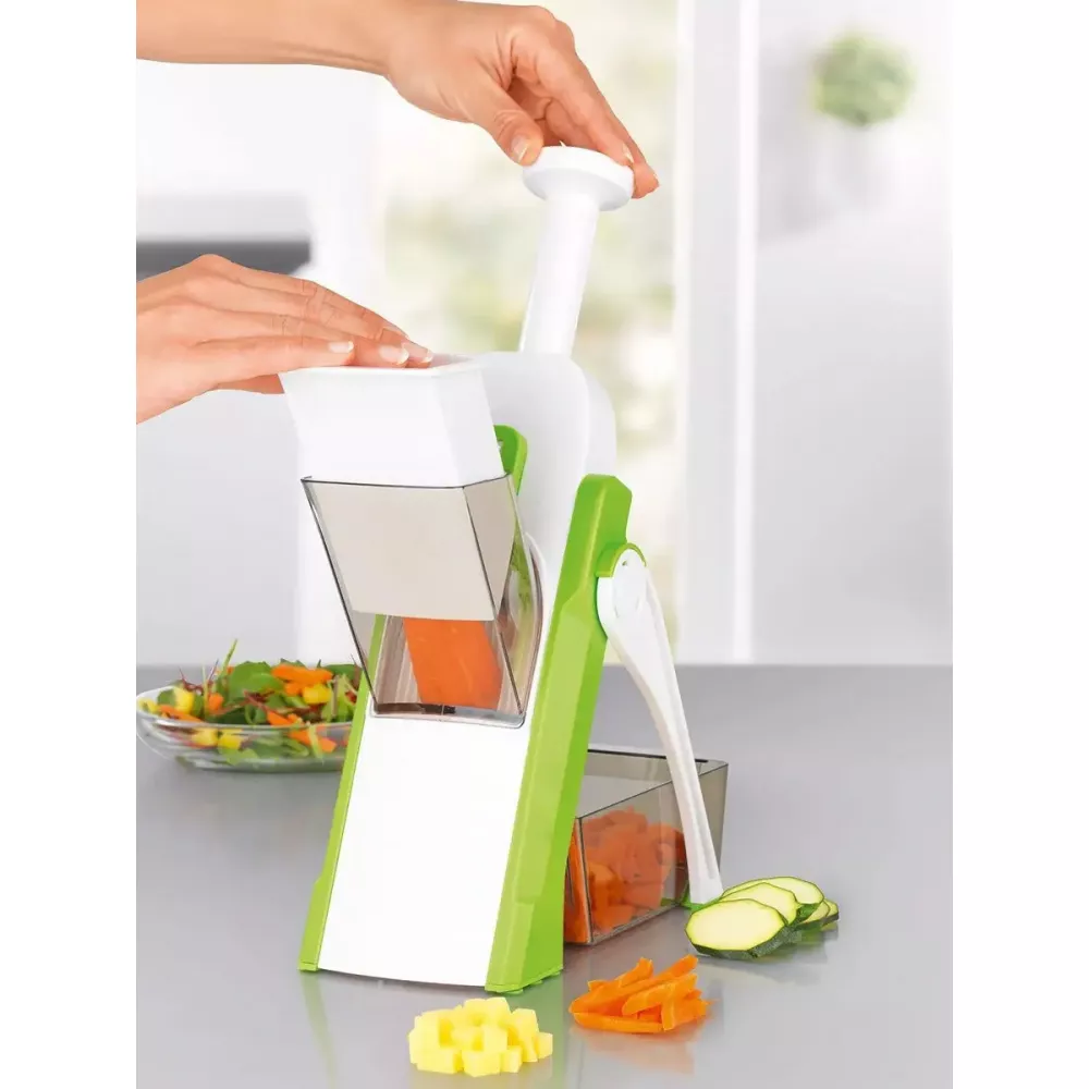 Этот многофункциональный слайсер обладает 24 вариантами измельчения продуктов. Мультислайсеру по силам порезать овощи и фрукты кубиками, кружочками, соломкой, брусочками разной толщины и длины.