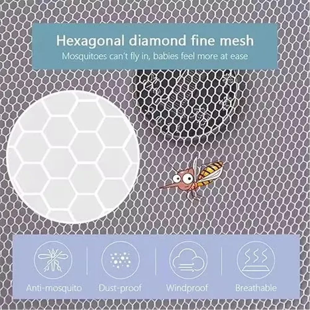 Эта противомоскитная сетка для коляски имеет шестиугольную сетку с ячейками 1 мм, более прочную, чем традиционная круглая сетка. Идеально защищает от мелких комаров, обеспечивает вентиляцию и воздухопроницаемость.
