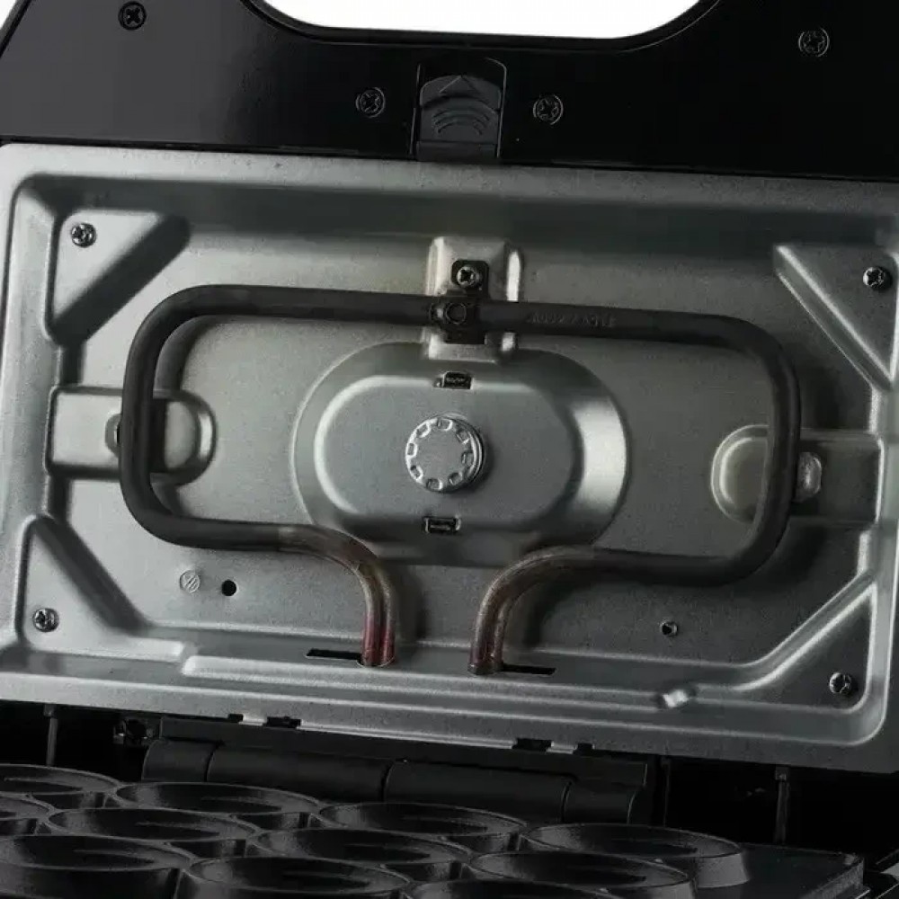 С двух сторон прибора размещены нагревательные элементы в виде металлического тена и формы-пластины, которые соприкасаются с приготовляемыми продуктами и сверху и снизу. Это обеспечивает быструю и равномерную готовку без необходимости переворачивать приготовляемые блюда.