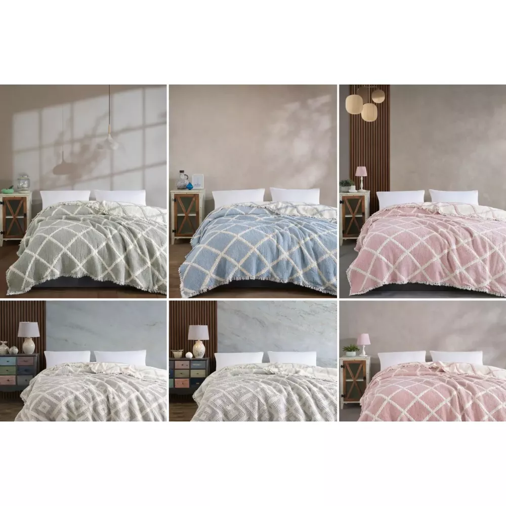 Полотно покрывала украшено классическим и стильным геометрическим узором в виде ромбов. Он создан путем сложного переплетения нитей, что придает изделию объем и игру светотени.