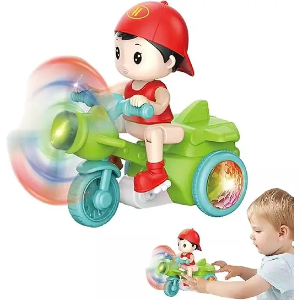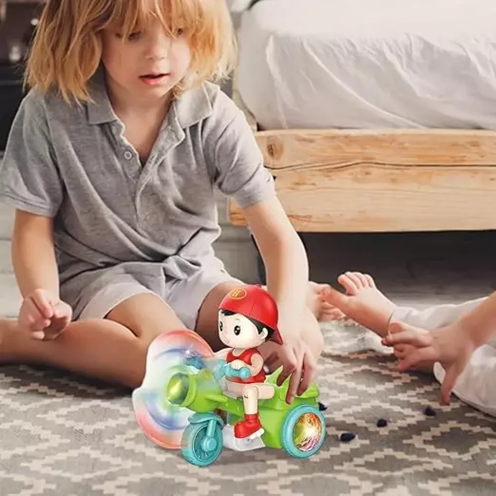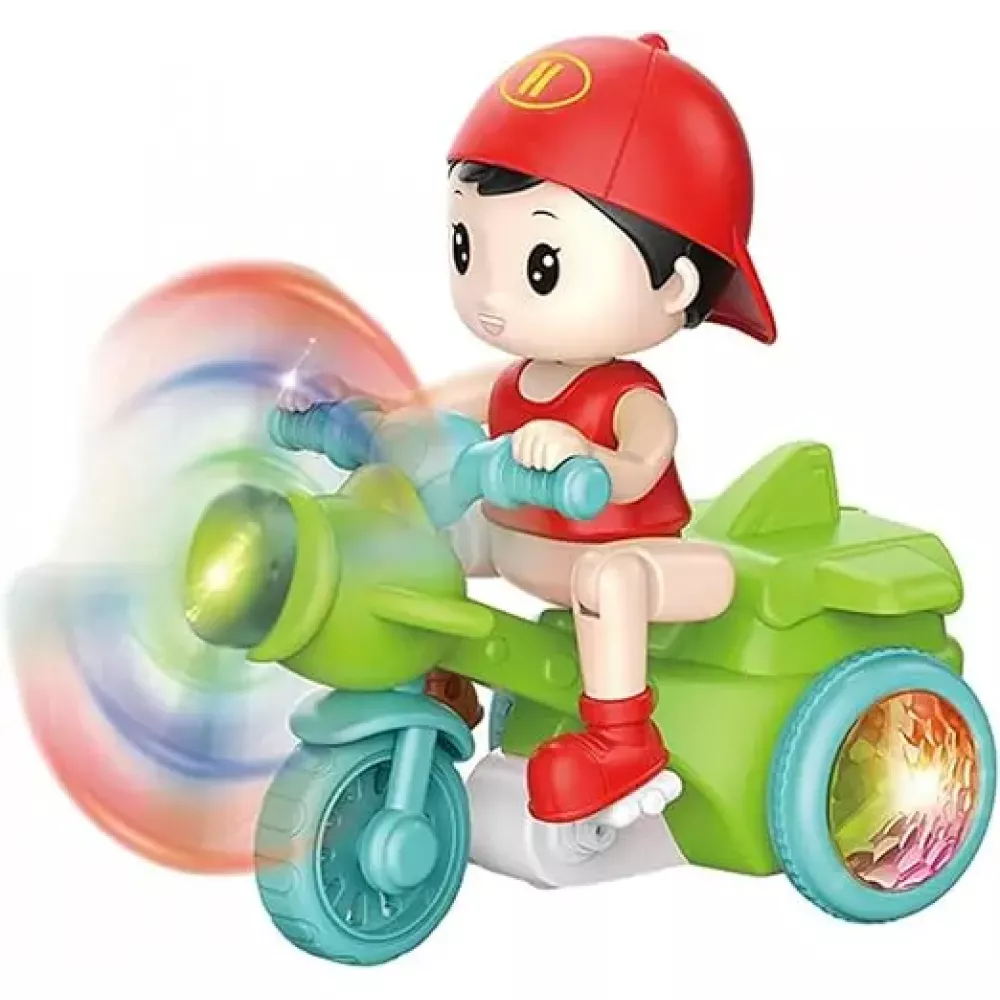 Маленький затейник поразит детей своим умением ловко кататься на трехколесном транспорте и делать невероятные трюки, стоя на задних колесах. Удивительное вело шоу сопровождается фантастическим сиянием диско шаров, которое рассеивается по комнате, как только рука ребенка коснется кнопки включения игрушки.