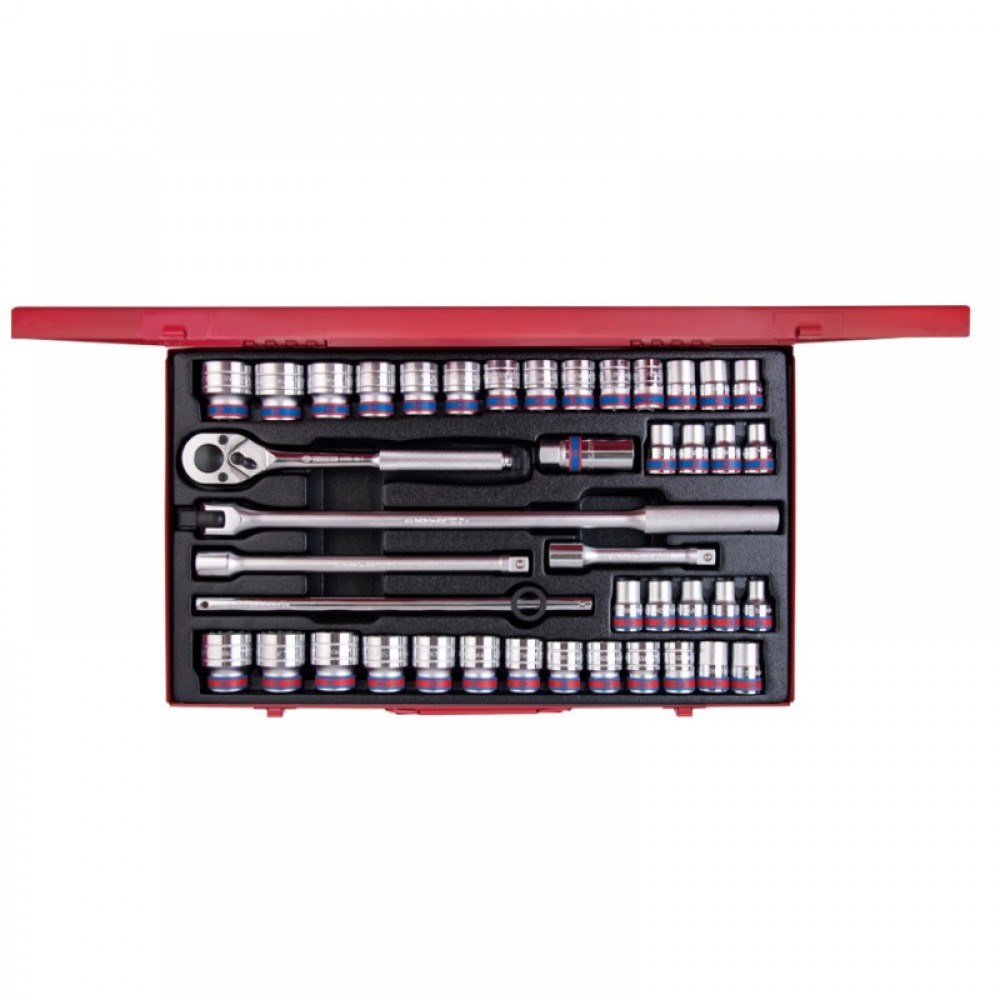 · Тріскання з прапорцевим перемикачем 4768-10F.· Вороток з плаваючою головкою – 4572-12.· Вороток з карданом - 4452-18FR.· Подовжувачі 4251-05R та 4251-10R (5 та 10 дюймів).· Головка свічкова - 463021R.· Торцеві головки метричні 10-32 мм.· Торцеві головки дюймові 5/16-1-1/4. Супроводжується комплект інструменту металевою скринькою з ложементом. Розміри кейсу – 476х282х57 мм. Вага набору інструментів – 8,5 кг.