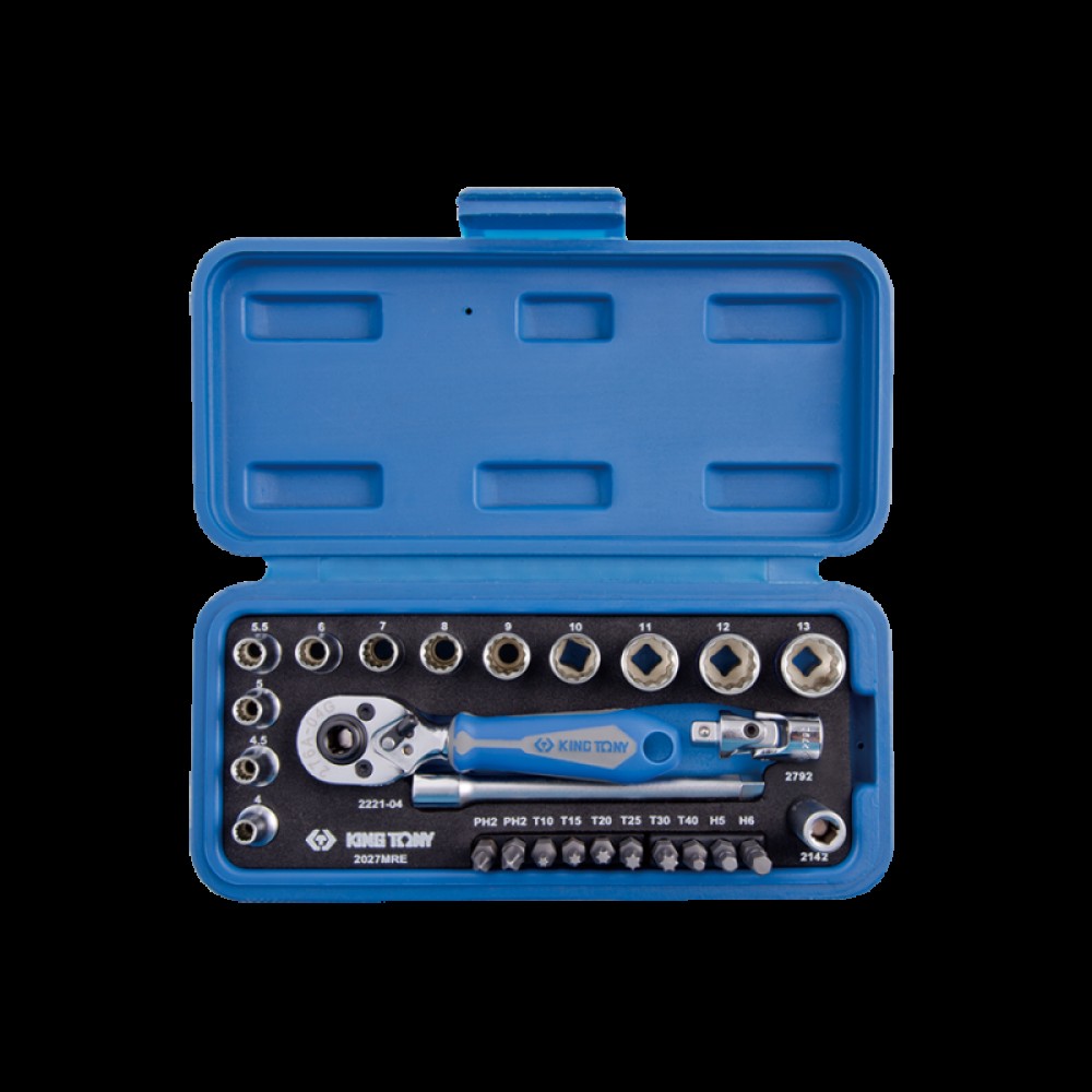 Набор 12-гранных торцевых головок с принадлежностями King Tony 1/4", 4-14 мм, 27 предметов 2027MRE применяется при ремонте и обслуживании легковых автомобилей, мото- и другой техники, различного оборудования и небольших конструкций как профессионалами, так и частными мастерами.