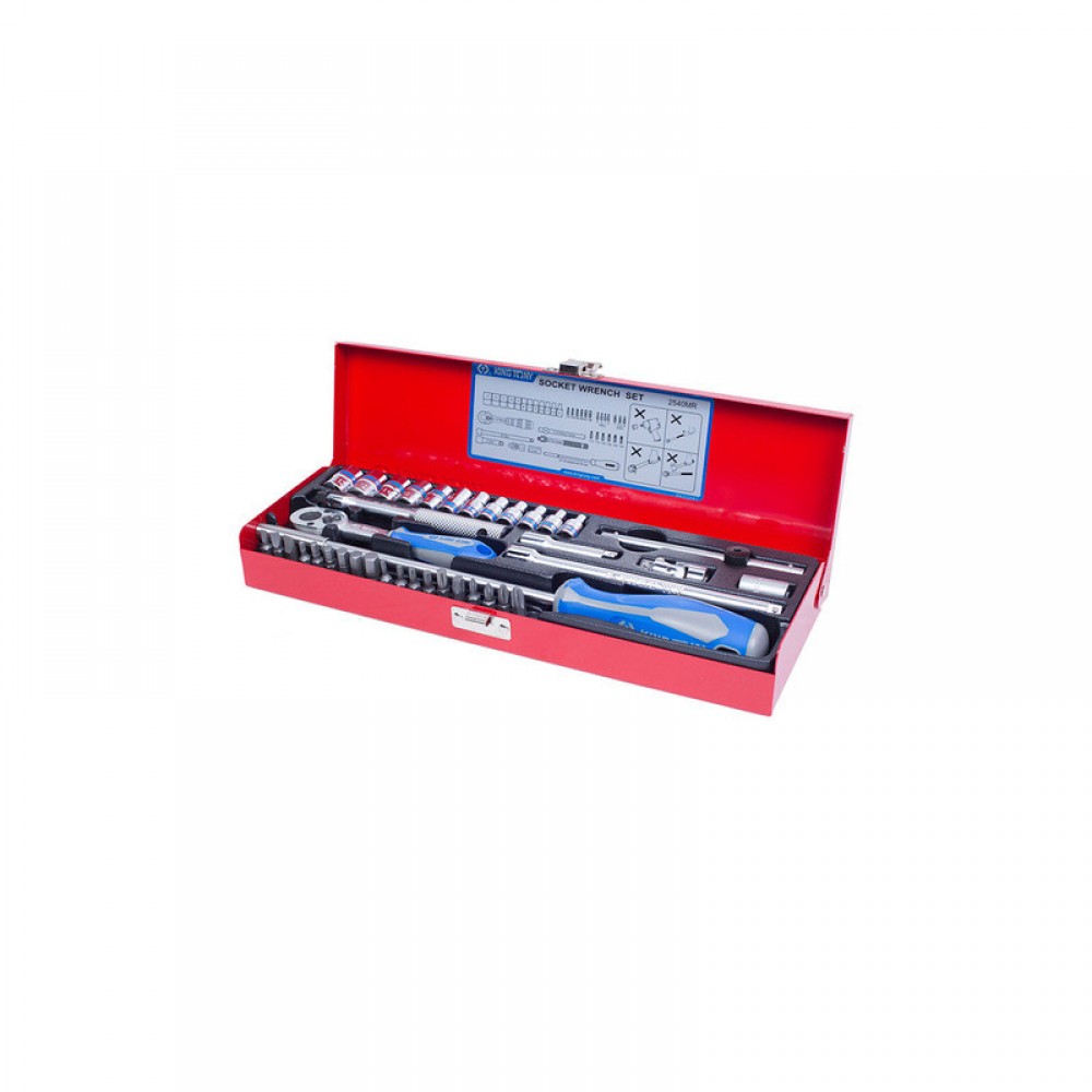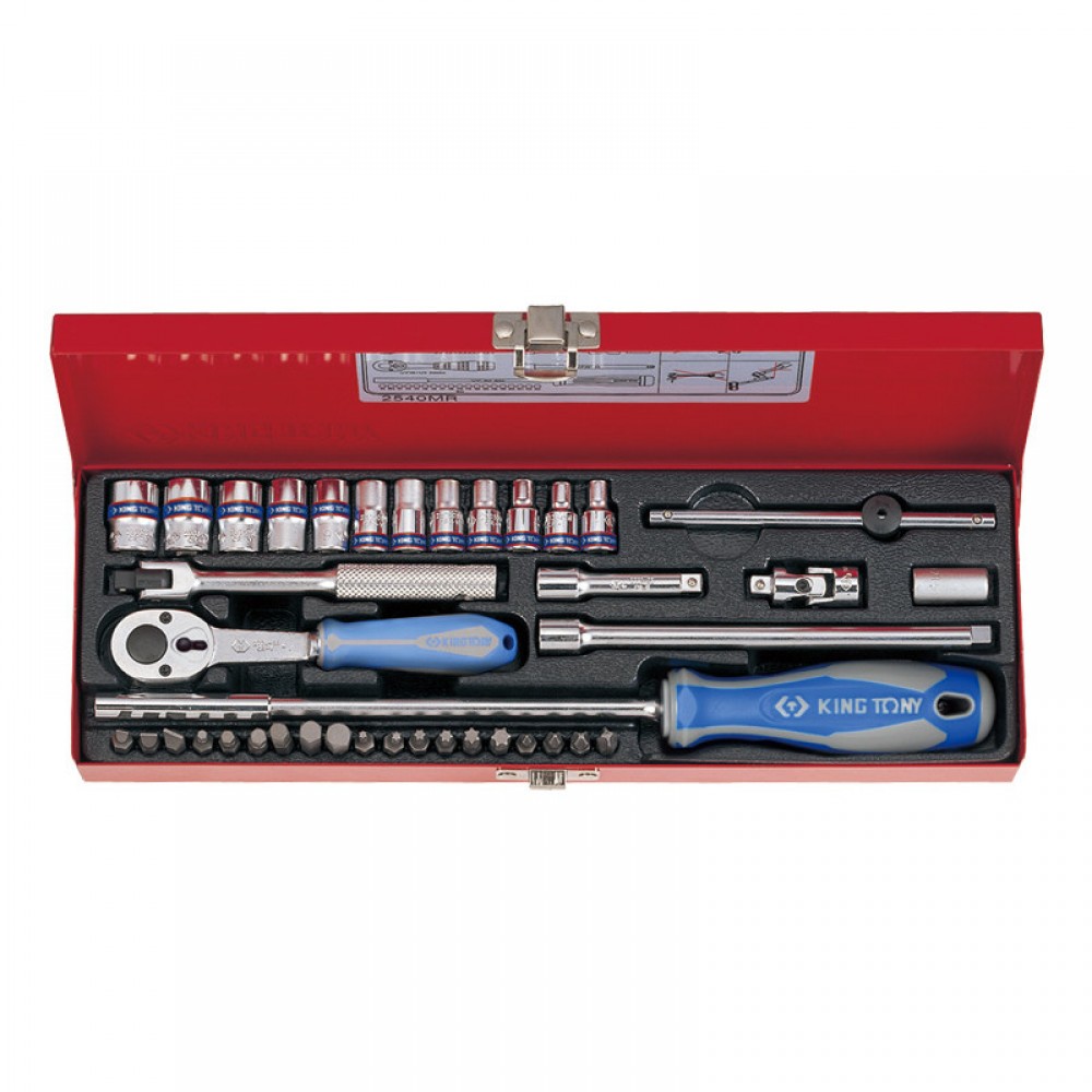 Набір інструментів 40 од. 1/4" KINGTONY 2540MR Головки торцеві 1/4" 6-гранні: 4, 4.5, 5, 5.5, 6, 7, 8, 9, 10, 11, 12, 13 мм Вставки 1/4" TORX: T10, T15, T20, T25, T30, T40 Вставки 1/4" хрест: PH0, PH1, PH2, PH3 Вставки 1/4" шестигранники: H3, H4, H5, H6, H7, H8 Вставки 1/4" шліцеві: SL4, SL5.5, SL7 Тріскачка 1/4" з прапорцевим перемиканням 130 мм Викрутка-бітоутримувач магнітний: 300 мм Перехідник-бітоутримувач 1/4">1/4" Вороток ковзний: 115 мм Кардан 1/4" Вороток шарнірний 1/4": 130 мм