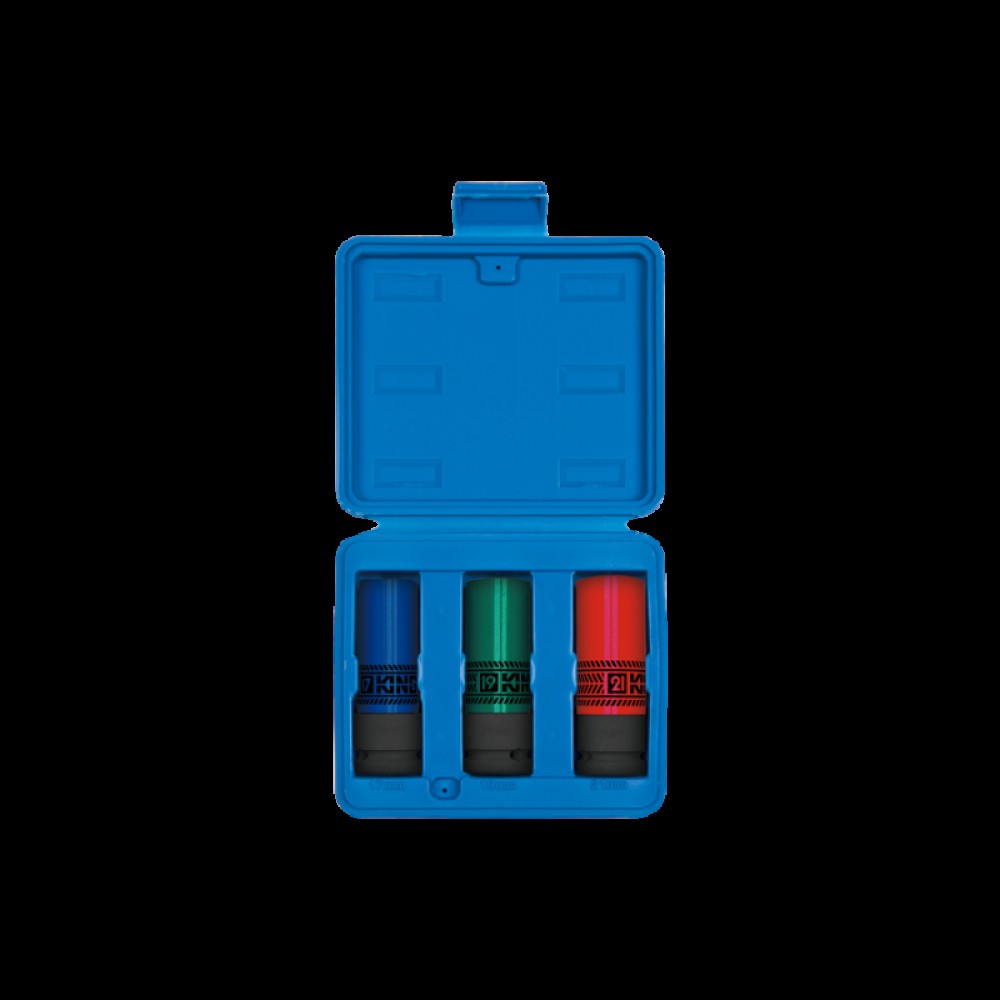 Квадрат, що приєднується, 1/2" Матеріал - хром-молібденовий сплав Використовується з пневматичним інструментом Міцний пластик на головках захищає полірування диска від пошкоджень Розмір головок: 17, 19, 21 мм Пластмасовий футляр: 149 х 132 х 45 мм Кількість: 3 предметів Тип голівок: тонкі Вага: 0.94 кг
