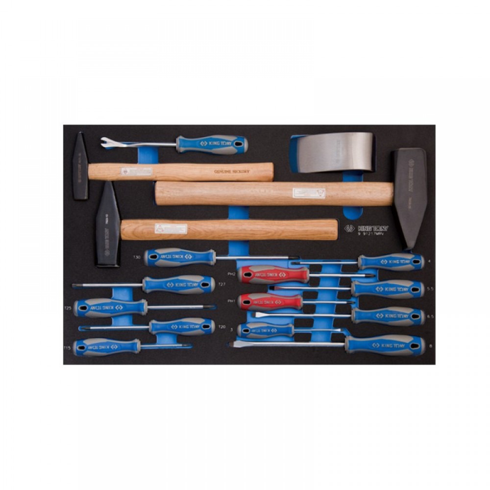 Набор инструмента King Tony (9-91217MRV) – это комплект слесарных принадлежностей для инструментальной тележки. Поставляется вместе с ложементом EVA 560х375 мм. Набор предназначен для проведения кузовных работ. В частности, для ремонта обшивки салона.