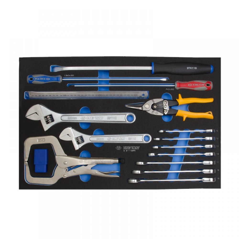 Набір інструменту комбінований 24 предмети King Tony (9-91124MRV) – це комплект слюсарного приладдя для системи зберігання інструменту. Постачається у комплекті з ложементом EVA. Призначений для розміщення в шухляді інструментальної тумби або столу розміром 560х375 мм. Користується попитом набір в автосервісі та виробництві.