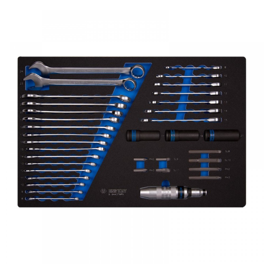 Набор инструмента комбинированный 37 предметов King Tony 9-94437MRV – это комплект слесарной оснастки, предназначенной для совместного использования с системами хранения. Помимо инструмента, набор включает в себя EVA ложемент размером 560х375 мм. У комплекта нет целевого назначения, так как ассортимент слесарных принадлежностей не полный. Задача набора – дополнить востребованным инструментом систему хранения для автосервиса.