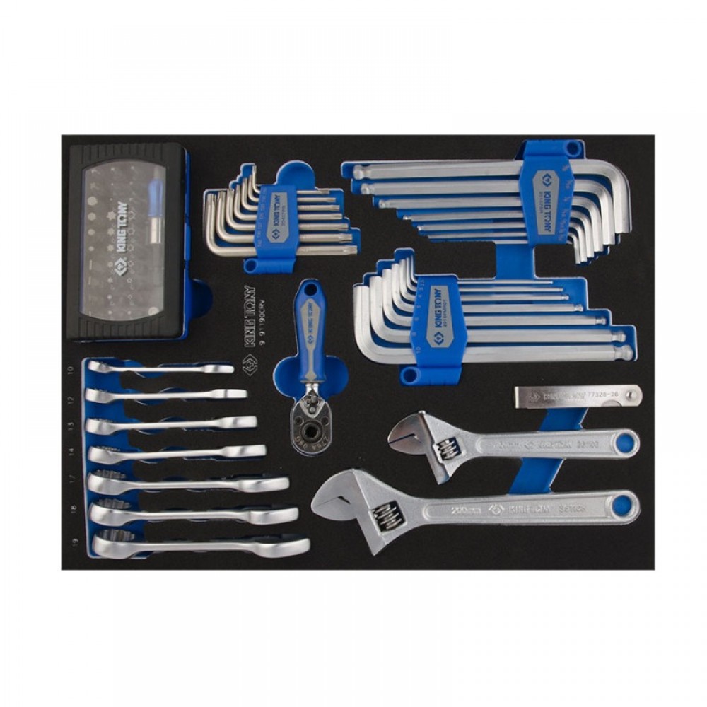 Купити комбінований набір інструментів для автосервісу Особливість набору слюсарного оснащення Кінг Тоні 9-91190CRV у тому, що він випускається для комплектації систем зберігання інструменту. Для повноцінної роботи на станції ТО потрібні базові набори слюсарного приладдя. Комбінований набір інструменту 9-91190CRV включає: