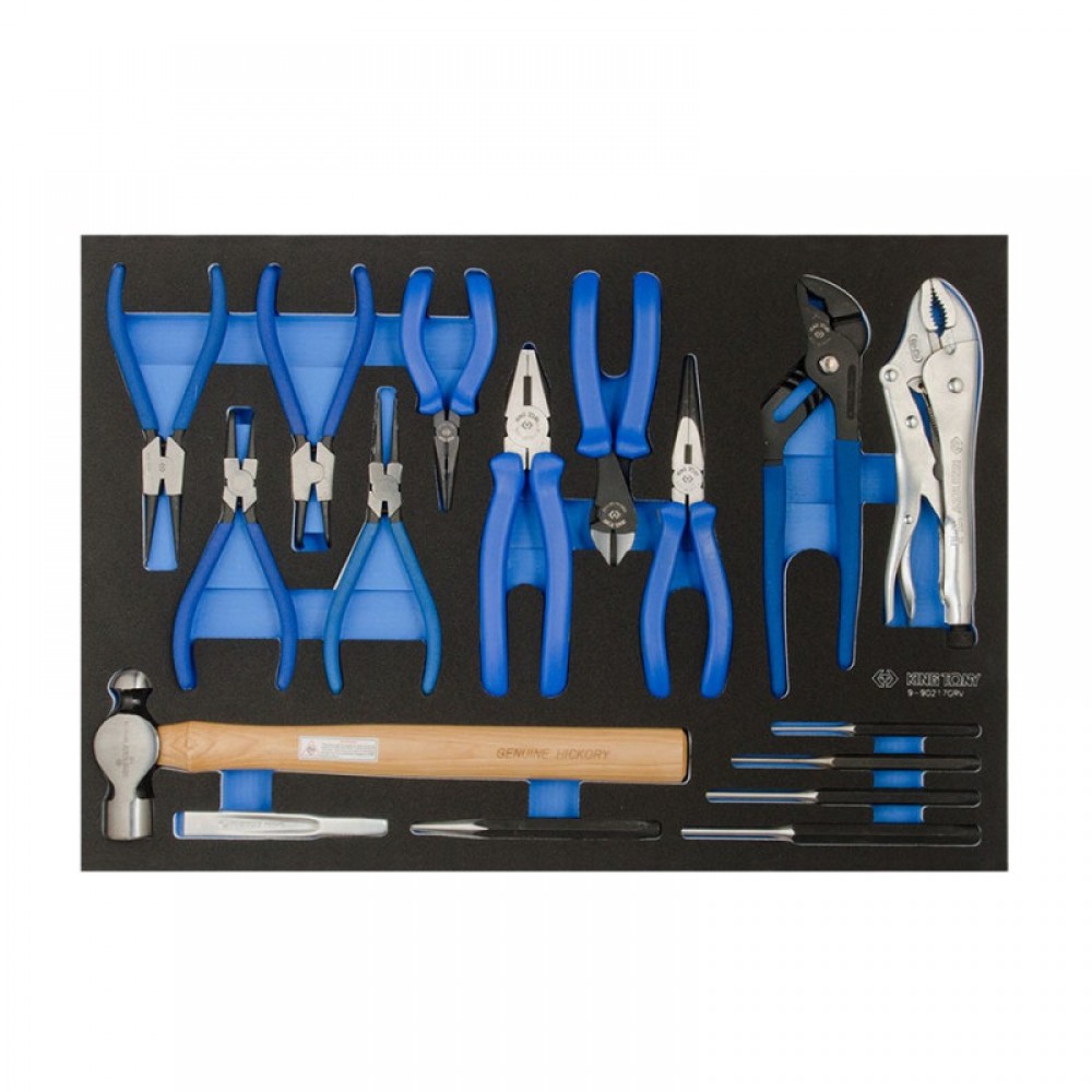 Набор инструмента комбинированный губцевого 17 предмета (EVA ложемент) King Tony 9-90217GRV – это комплект слесарной оснастки. Предназначен инструмент для проведения механической обработки деталей и заготовок в условиях автосервиса. Включает в себя шарнирно-губцевый и ударный инструмент. Особенность в компоновке – предназначен комплект для оснащения выдвижных ящиков системы хранения инструмента (560х375 мм).