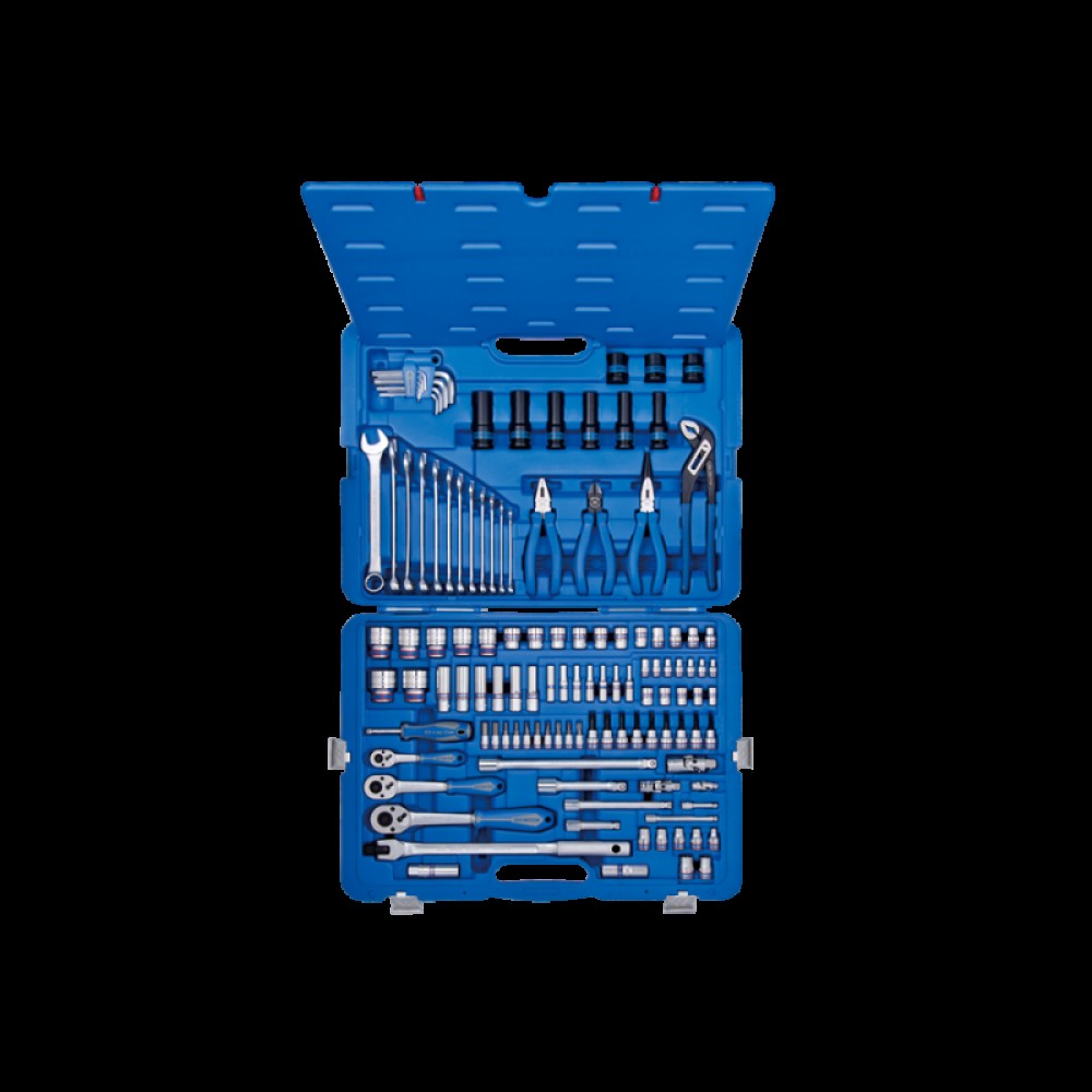 Особенность этого набора слесарной оснастки в удобной компоновке. Огромный ассортимент торцевых головок, воротков и трещоток под разные посадочные квадраты (1/4,3/8, 1/2 дюйма). В дополнение, набор включает в себя комбинированные гаечные ключи и шарнирно-губцевый инструмент. Купить комплект инструмента выгодно по цене и качеству. Ведь тайваньский производитель позиционирует этот набор, как инструмент для профессионалов.
