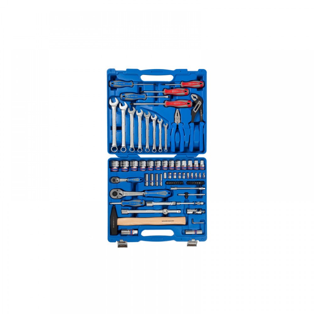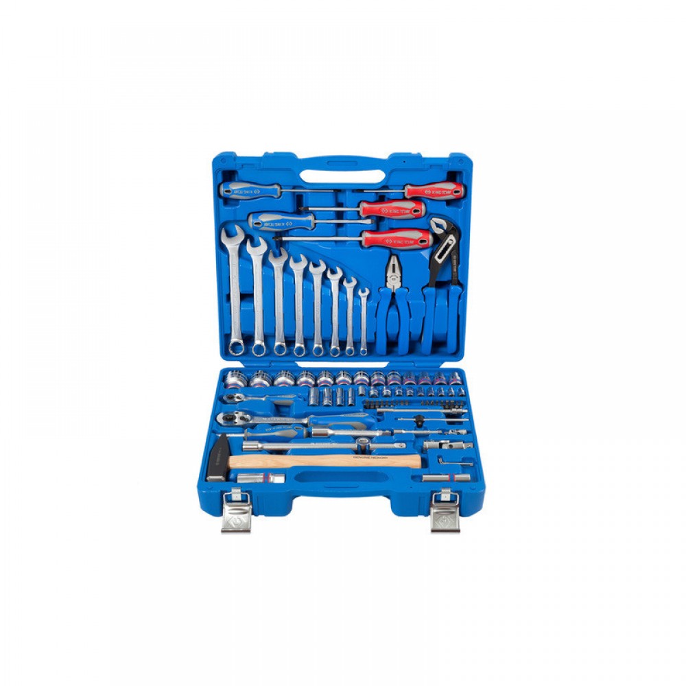 Универсальные приспособления для сборки и ремонта техники, укомплектованы в универсальный набор инструментов 77 ед. 1/4“+1/2”. Качественные изделия из металла помещаются в компактный кейс, где имеется место для каждой мелочи. Комплектация профессионального набора предусматривает адаптеры под биты, шестигранники, отвертки и молоток. Для работы с торцевыми головками применяются трещотки с быстрым съемом.
