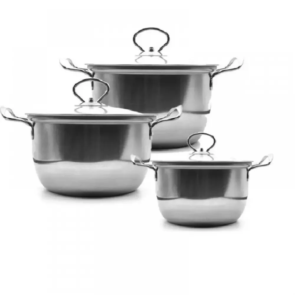 Кастрюлы быстро нагреваются, равномерно распределяя тепло по всей площади основания и долго сохраняют тепло. Набор посуды отлично подойдет для всех видов плит, в том числе и индукционных. На крышках и по бокам кастрюль расположены клепаные, не нагревающиеся ручки. Прозрачные крышечки из жаропрочного стекла позволит наблюдать за всем процессом приготовления пищи от самого начала и до конца, стекло крышки не будет запотевать, так как имеет отверстие для выхода пара.