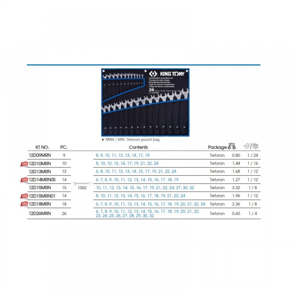 Набір комбінованих ключів KING TONY 12D13MRN застосовується при монтажі та демонтажі різьбових з'єднань. Накидна та ріжкова частини мають нахил, що робить ключі зручнішими для роботи у важкодоступних місцях. Комплектація даного набору включає ключі всіх розмірностей від 6 мм до 24 мм без перепусток розмірів, що рідко зустрічаються. Ключі комбіновані, серії 1062 розміри -6, 8, 10, 11, 12, 13, 14, 15, 17, 19, 21, 22, 24 Якість Ключі виготовлені із інструментальної легованої хром-ванадієвої сталі спеціального сплаву. Технологія виготовлення ключів включає метод гарячого кування з подальшою термообробкою, що надає ключам особливу міцність і високу надійність. Хромоване покриття захищає від корозії. Відповідають вимогам стандартів DIN 3113, ISO 7738.
