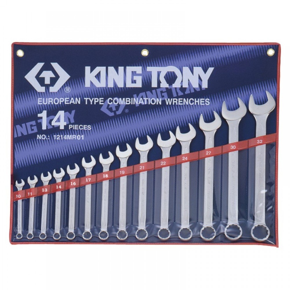Ключі комбіновані 10-32 мм (компл. 14 шт.) Ключ комбінований 1060 (10, 11, 13, 14, 16, 17, 18, 19, 21, 22, 24, 27, 30, 32) Набір ключів комбі 14шт - класичний комплект комбінованих 10-32 мм інструментів без пропуску, розмірів, що часто зустрічаються. Продукт призначений для станцій ТО та побутового використання. Але на практиці інструмент затребуваний у будівельників, електриків, власників автотранспорту, на підприємствах і в сільськогосподарському секторі. Комбінація набору комбі 14 шт – ріжковий та накидний ключ, універсальна. Місця з обмеженим доступом до кріплення або різьбове з'єднання, що прикипіло, не зупинять власника ручного інструменту King Tony. Накидний ключ має 12-гранний профіль, що дозволяє працювати з 6-ти і 12-гранними болтами і гайками. Зручності в роботі додає комфортний чохол з теторону (ПЕТФ), де під кожен ключ виділено власний осередок. Формат чохла дозволяє власнику монтувати ключі на верстаті або інструментальному стенді. Експлуатація у промислових умовах та довічна гарантія – переваги набору ключів комбі 14 шт. Виготовлені методом гарячого кування з інструментальної сталі аксесуари, обіцяють користувачеві надійність та довговічність. Легований хромом і ванадієм метал стійкий до агресивного середовища, мастил, органічних кислот.