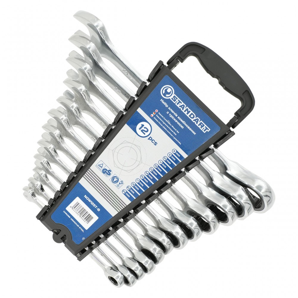 Набір комбінованих ключів з тріскачкою СТАНДАРТ NGW12ST-B розроблений для ефективного виконання широкого спектру ремонтних і монтажних робіт. Завдяки вбудованому тріскачковому механізму кожен ключ забезпечує комфортне і швидке закручування або відкручування кріплень, істотно економлячи час і зусилля користувача.
