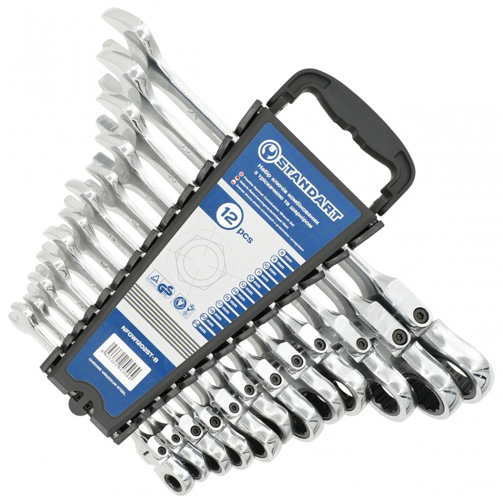 Набір ключів комбінованих із тріскачкою та шарніром 8-15,17, 19, 22 мм 12ед. на холдері СТАНДАРТ NFGW1202ST-B