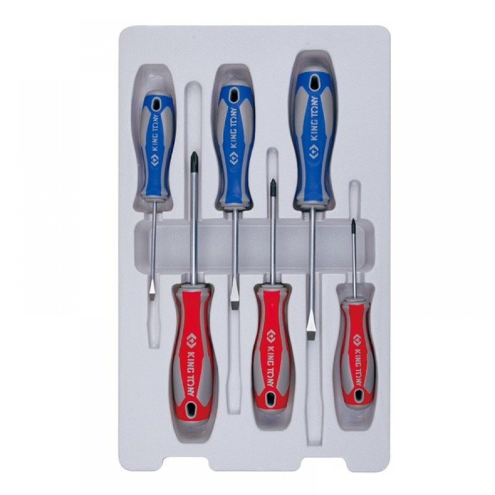 Набор отверток в коробке, 6 предметов – слесарный ручной инструмент для откручивания или монтажа элементов резьбовых соединений. Набор востребован в автосервисе и на производстве. В комплект входят 2 типа отверток – с крестообразным и прямым шлицом разных размеров.